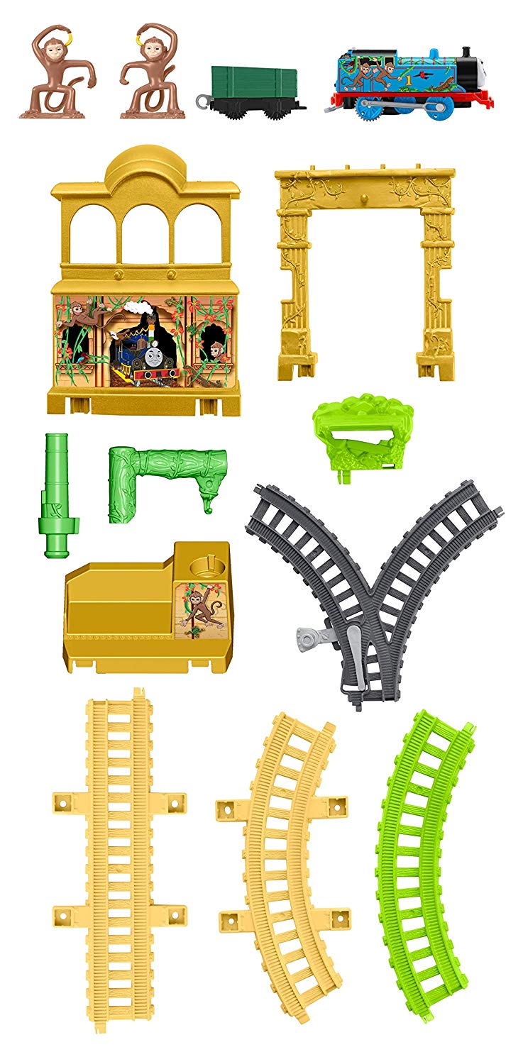 - TrackMaster train set includes motorized Thomas, full track layout, cargo car, palace, gantry, two monkey figures and platform with pivoting tree limb