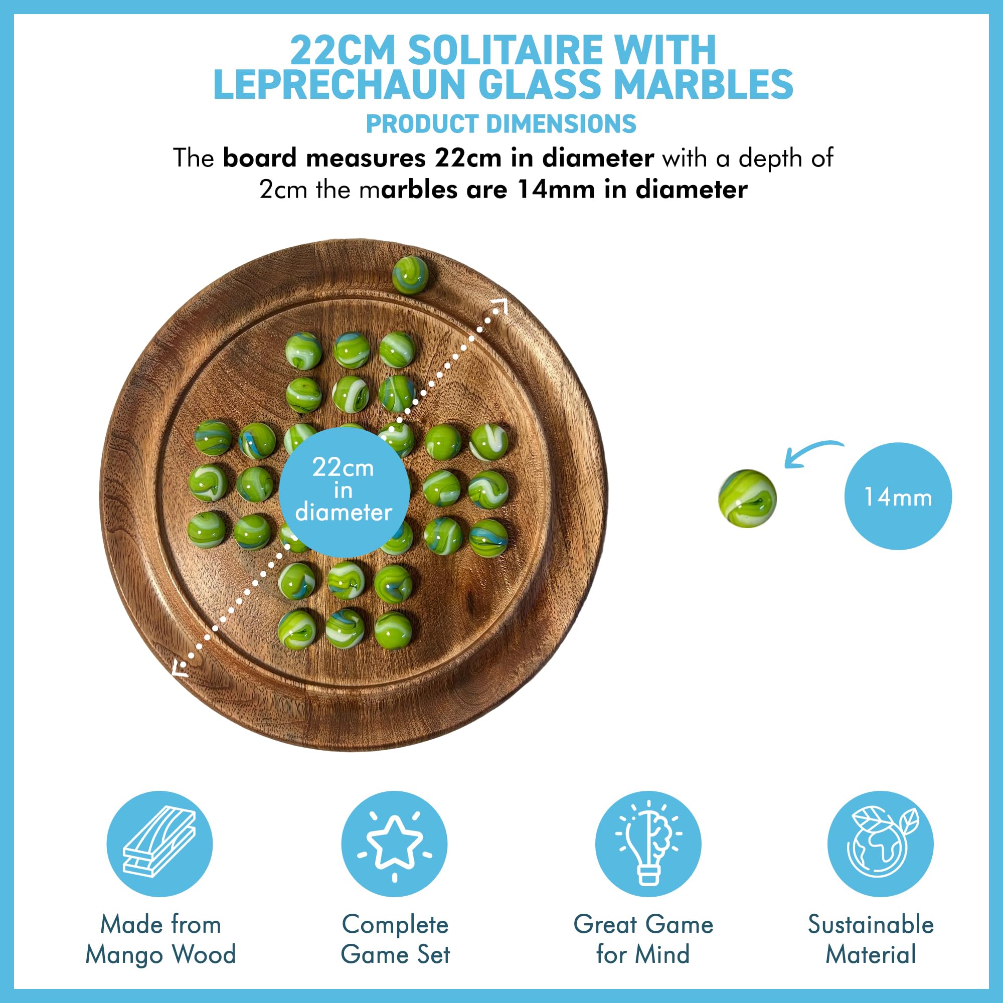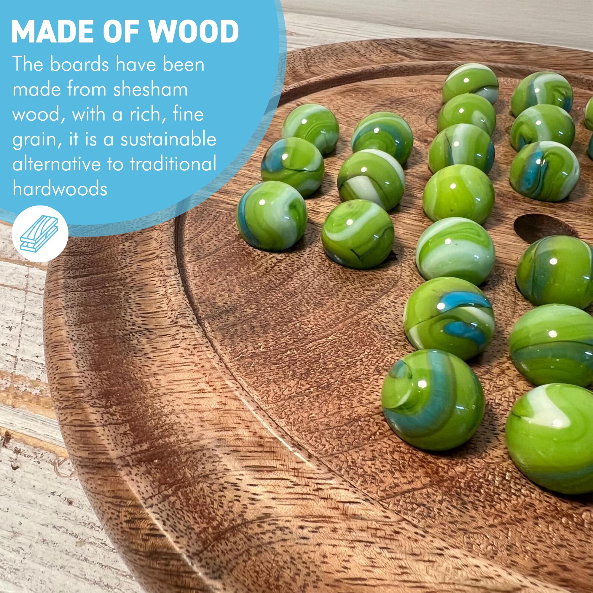 Carefully carved from Shesham wood, this beautifully crafted solitaire set is a joy to play. When set on a coffee table this game will keep idle hands occupied and minds tested. This beautifully crafted solitaire game set comes complete with a set of 32 green leprechaun glass marbles (plus 1 spare) which sit upon a circular board of dark wood to create a stunning contrast between the pieces, the grooved perimeter allows the spare marbles to stay close at hand. Equally entertaining for a casual player and anybody who wants to learn the advanced intricacies of the game, an engaging and challenging game come up with effective strategies to clear your puzzle board and win the game. Remove as many marbles as you can by jumping one piece over another. The board measures 22cm in diameter with a depth of 2cm | 8.5 inches diameter with a depth of 0.75 inches, the marbles are 14mm in diameter | 0.5 inches in diameter, Great for individual play and an ideal way to develop the strategic mind from an early age. The boards have been crafted from shesham wood, a hardwood with a rich, fine grain, it is a sustainable alternative to traditional hardwoods such as teak and mahogany. Great game for friends or family that enjoy playing fun games or puzzles, this would make an excellent present for any occasion or anybody who enjoys a challenging puzzle. Solitaire is perhaps the problem-solving puzzle of them all, this version of the game stays true to the classic style.