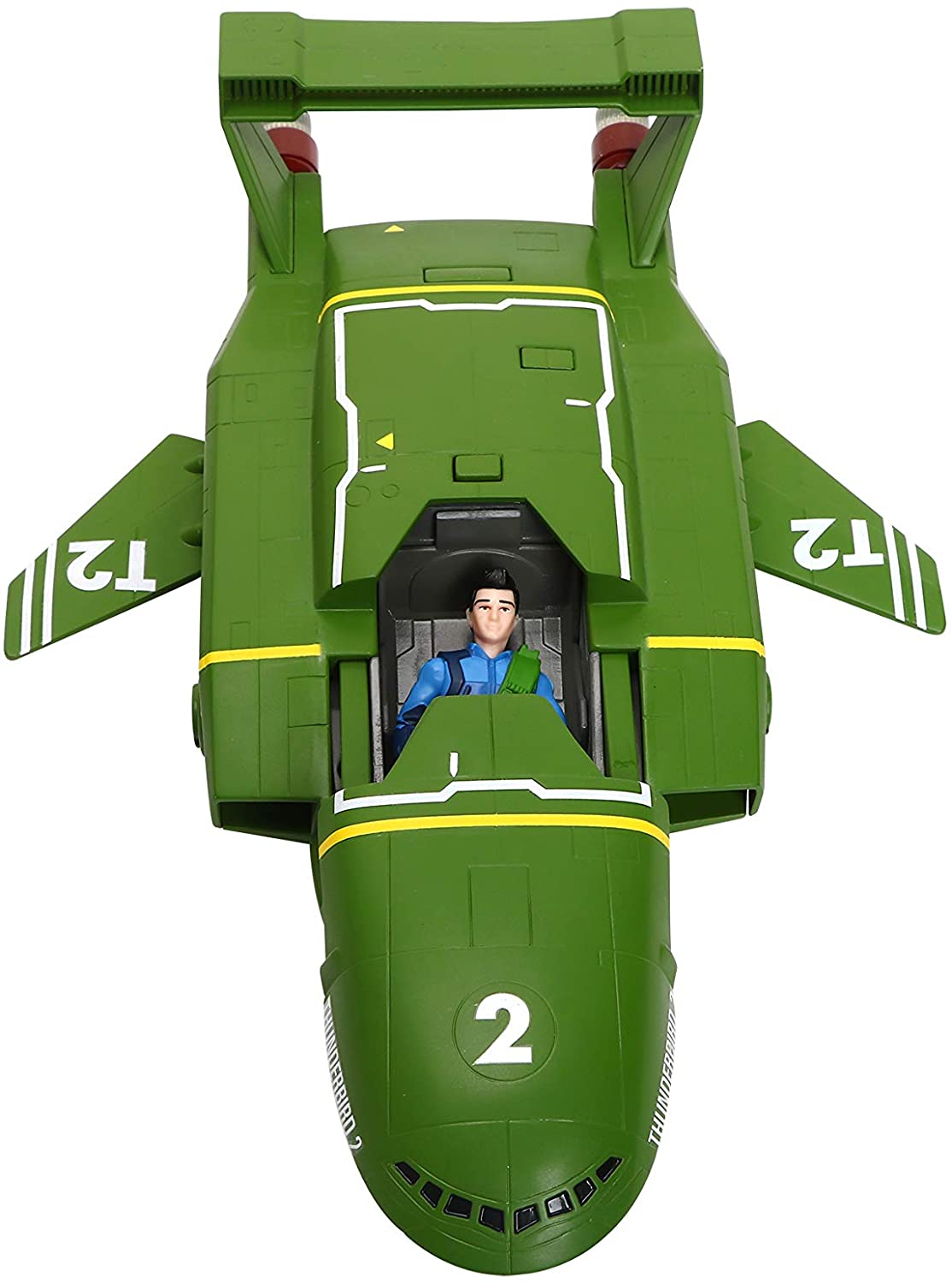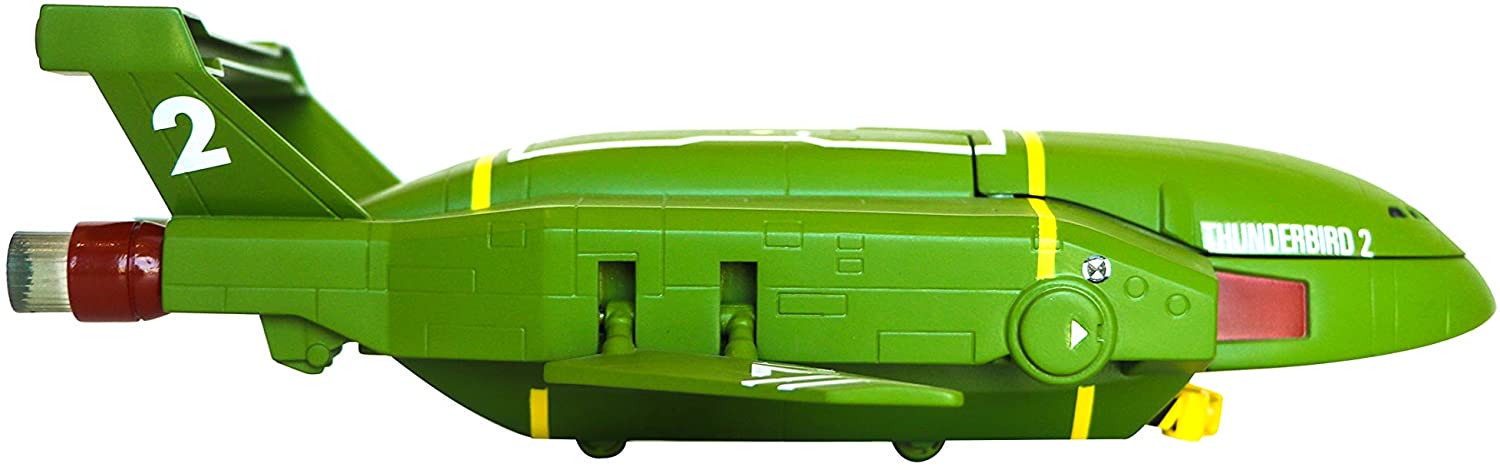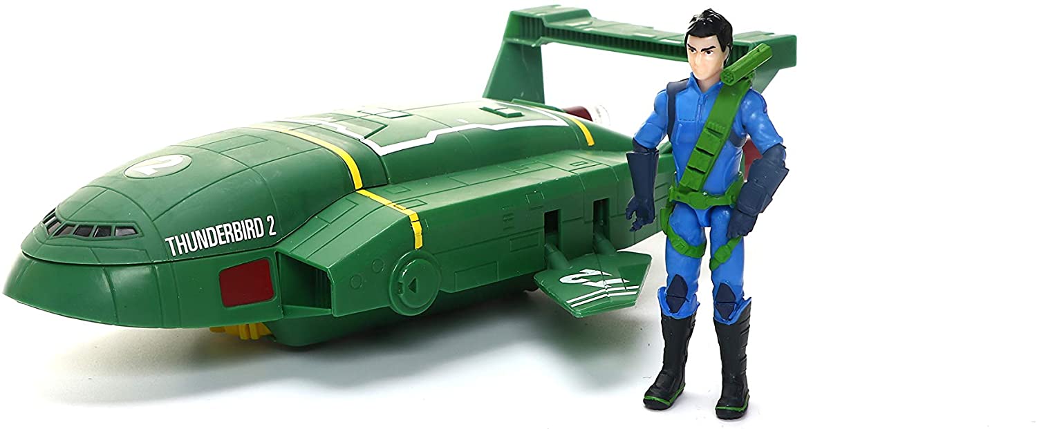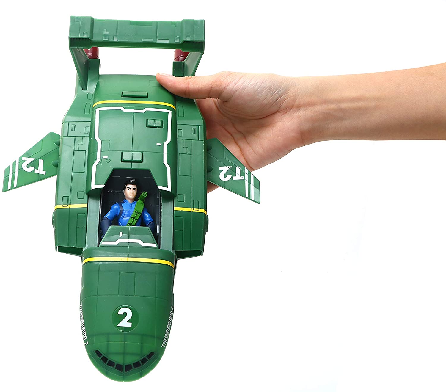 Thunderbird 2 is go! Virgil Tracy is ready for some rescue action in the Thunderbird 2 aircraft. Pilot the vehicle with virgil in the cockpit, and press the button for launch sounds as you recreate the take off. Release the grappling hook and see virgil slide down the zipline to the rescue! 2 x AAA batteries included.