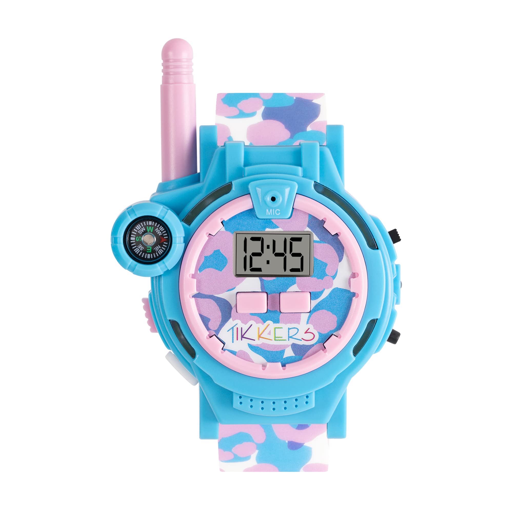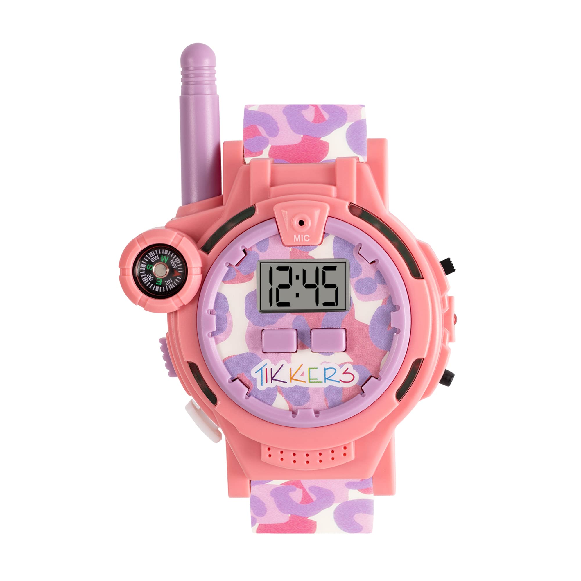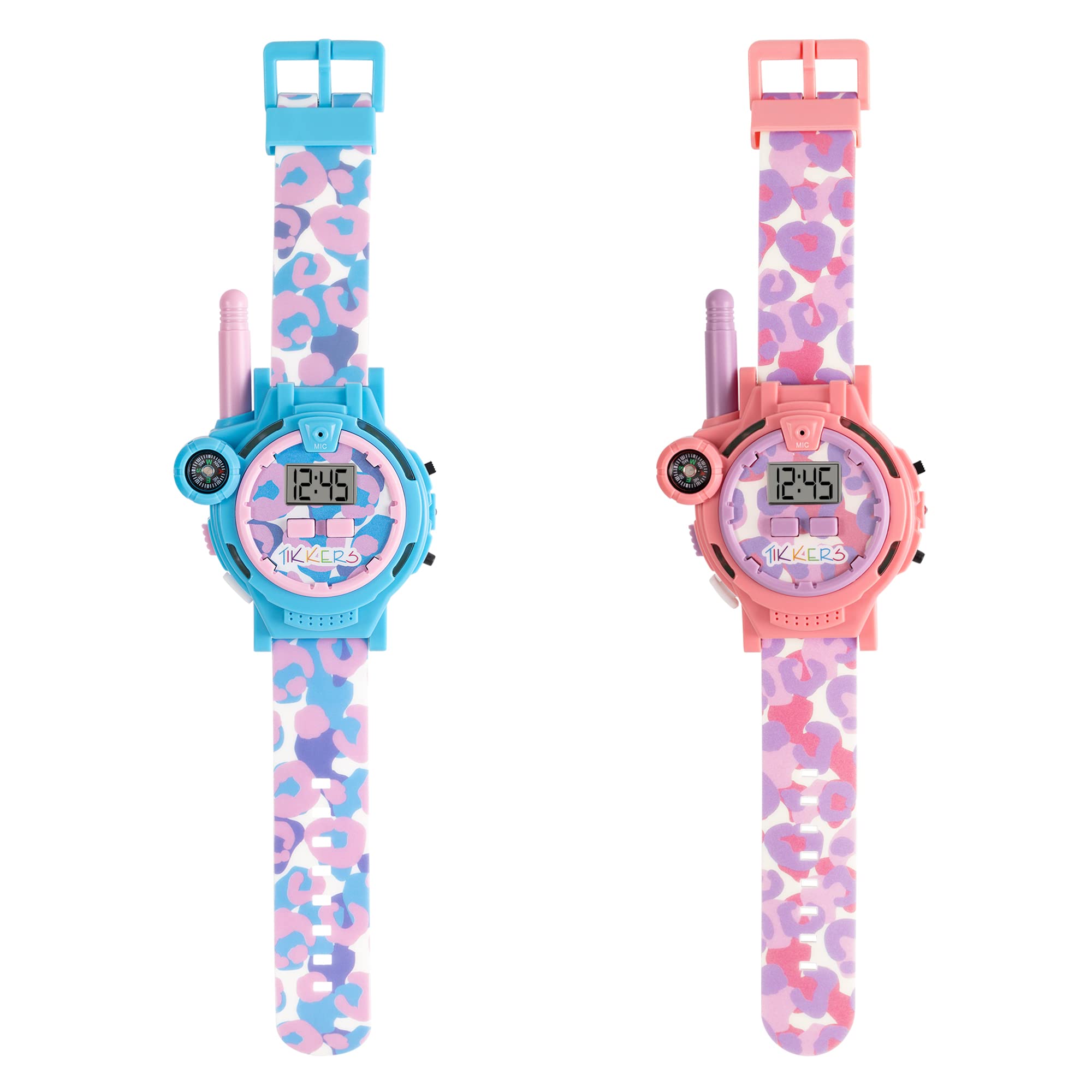 Tikkers Girls animal print Walkie Talkie Watch Set. Featuring a set of 2 Blue and Pink Animal Print walkie talkie watches with digital time dsiplay and printed silicone straps. The watch includes a walkie talkie switch, flash light button, antenna, compass, clock adjustment button and talk button. Packaged in official branded Tikkers packaging and comes with one year guarantee.