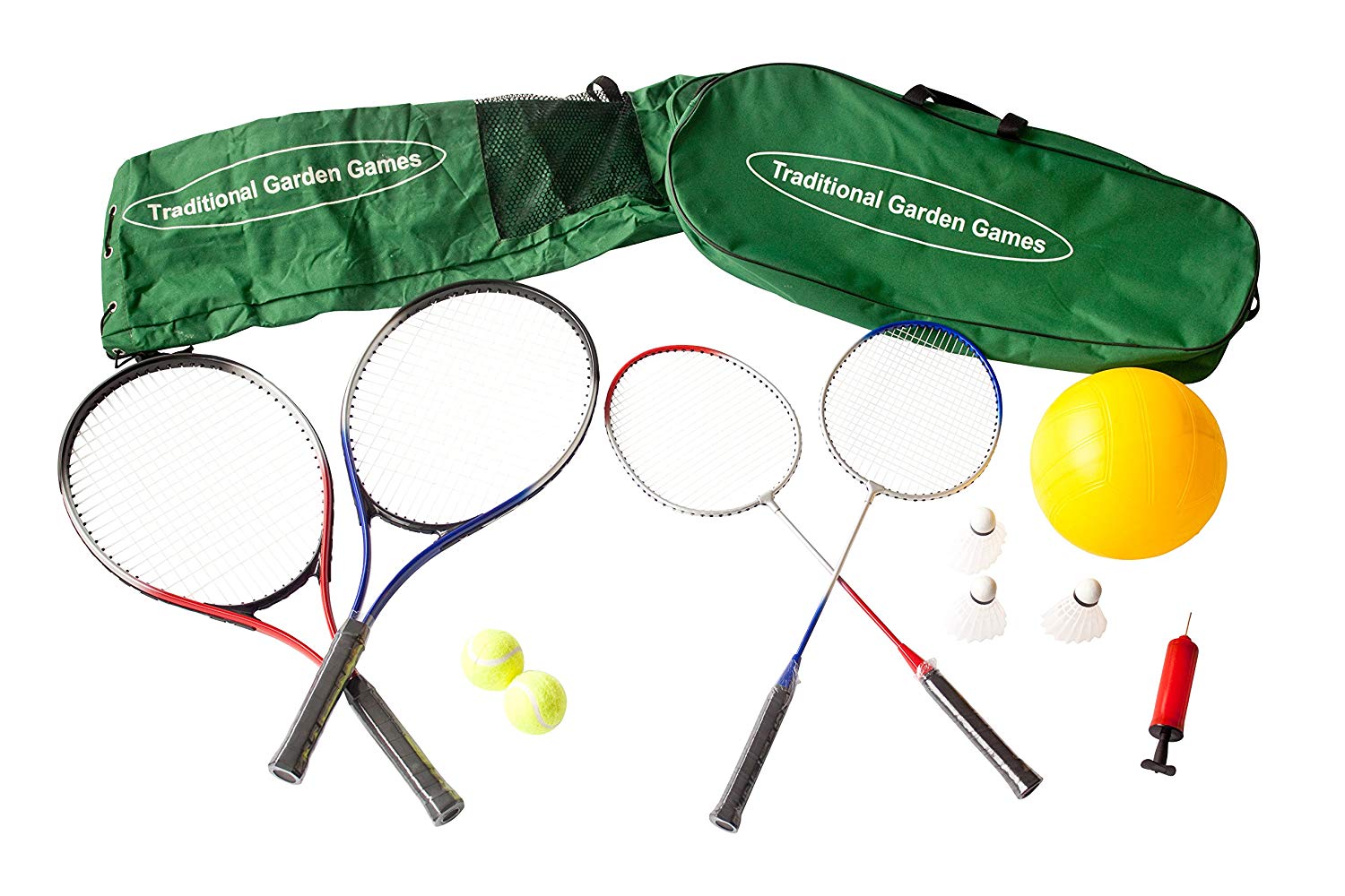 - The complete outdoor fun solution – Comes with 2 Badminton & 2 Tennis Racquets, 3 Shuttlecocks & 2 Tennis Balls, 1 Volleyball and Pump