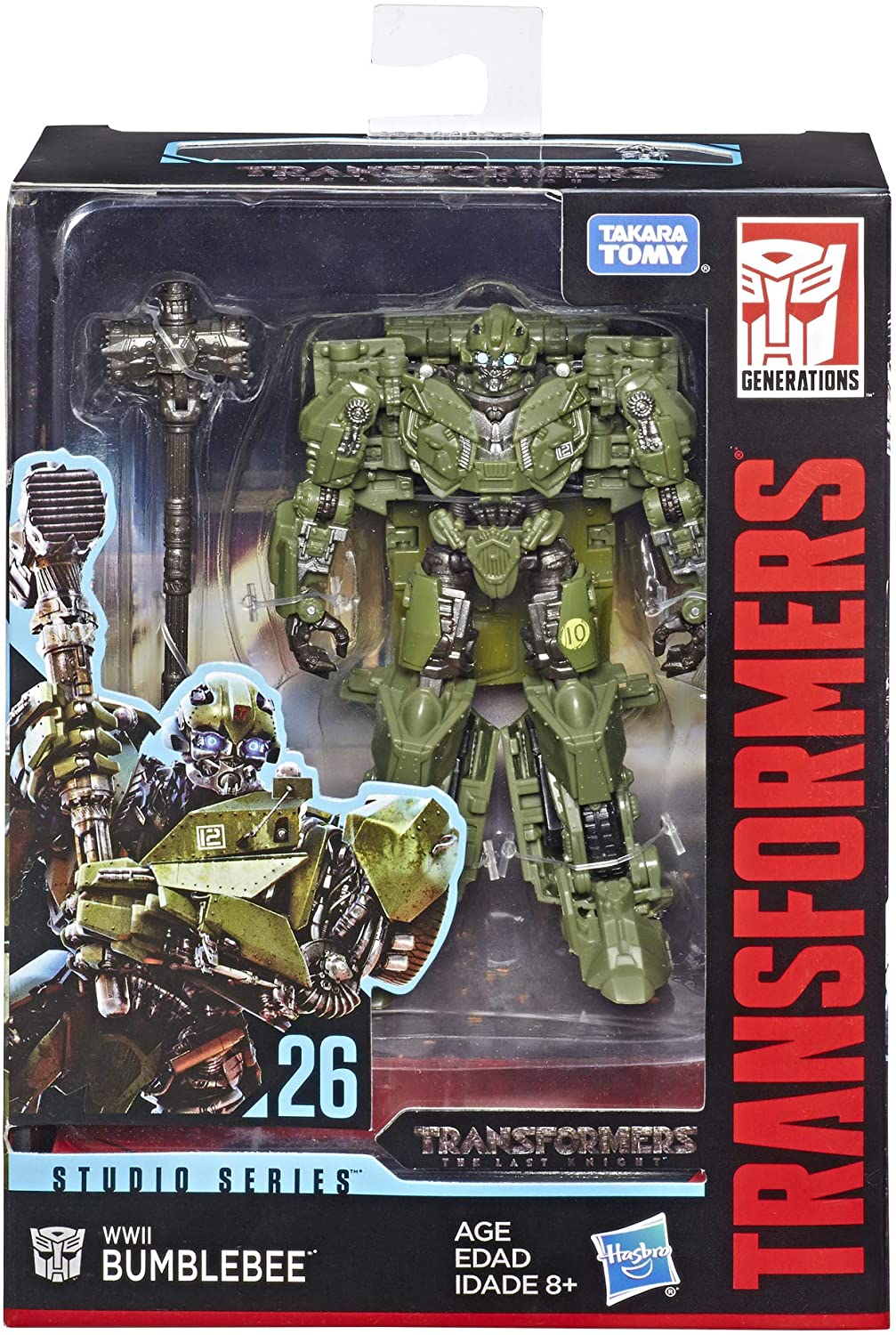 Reach past the big screen and build the ultimate Transformers collection with Studio Series figures, inspired by iconic movie scenes and designed with specs and details to reflect the Transformers movie universe. In the WWII Flashback scene from Transformers: The Last Knight, an combat-ready Bumblebee fights alongside soldiers as a powerful ally, unleashing war machine force on an enemy stronghold. This Studio Series 26 Deluxe Class Transformers: The Last Knight WII Bumblebee figure converts from robot to tank mode in 25 steps. Remove backdrop to showcase WWII Bumblebee in the WWII Flashback scene. Figure features vivid, movie-inspired deco and includes detailed weapon accessories: a blaster and a hammer modeled after the weapons Bumblebee uses in the film. Transformers and all related characters are trademarks of Hasbro.