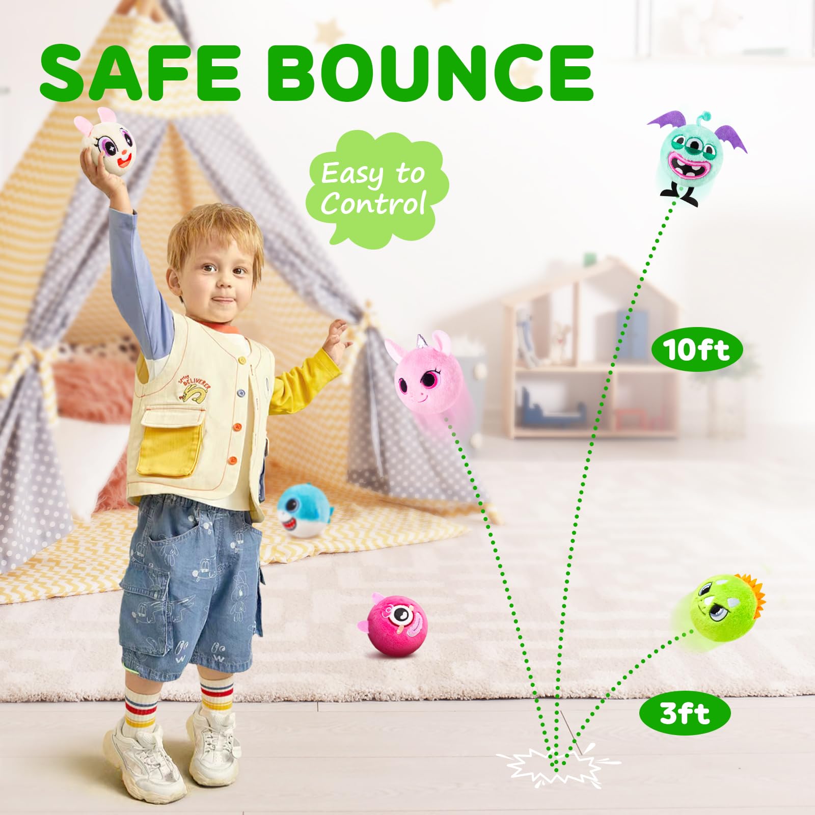 - Amazing High Bounce Up to 10 Feet! Watch your child’s eyes light up with joy! These are not ordinary plush toys; they are high-performance bouncy balls capable of reaching incredible heights up to 10FT (3 meters), encouraging active outdoor play and developing motor skills.
