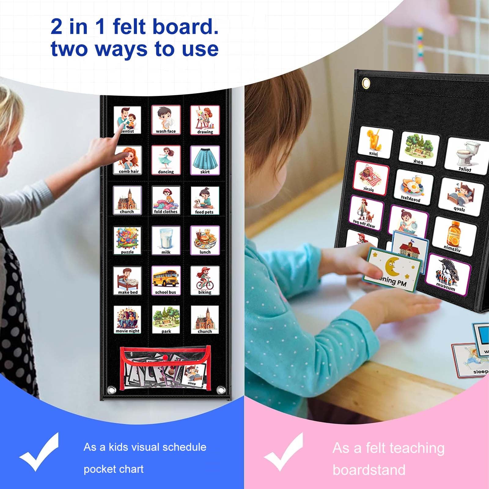 - Package IncludesYou’ll get 96 daily routine charts for children, 1 background felt strip and enough hook and loop dot stickers, come with clear file pouch with enough space for all your cards, and one rope, easy to hang