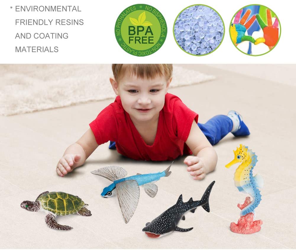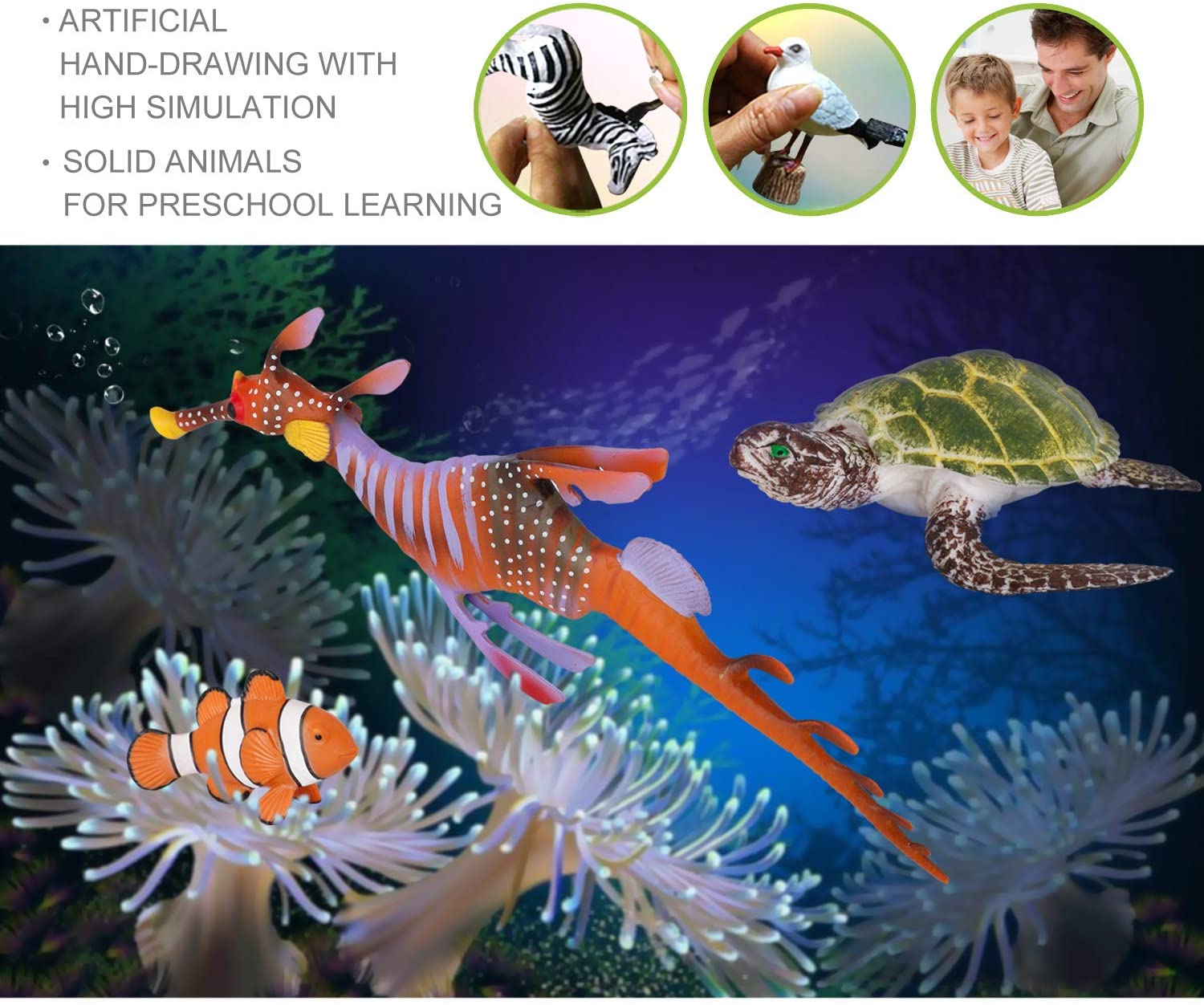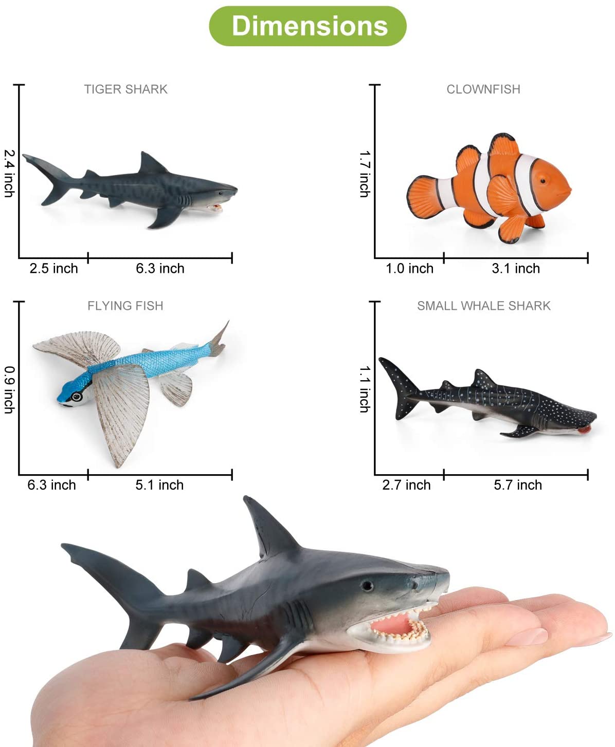 - 7 Indian Ocean Figures Set – Package includes 7 Indian Ocean figures: Green Sea Turtle, Small Whale shark, Flying Fish, Seahorse, Weedy Seadragon, Clownfish, Tiger Shark.