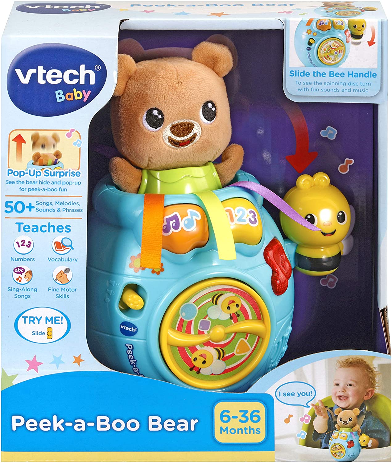Introducing the peek-a-boo bear by Vtech! Baby will get a lovely surprise when they press one of the two learning buttons on the honey pot, as a friendly fabric bear will pop up to play hide and seek! The buttons also play exciting music, catchy songs and fun phrases which support and encourage language development. Push the Bumble bee down to see the bees on the front spin! This cute little honey pot provides opportunities for your little one to develop their motor skills. The brightly coloured honey pot and colourful buttons support visual development. Features 4 fun sing-along songs and 15 Happy melodies.