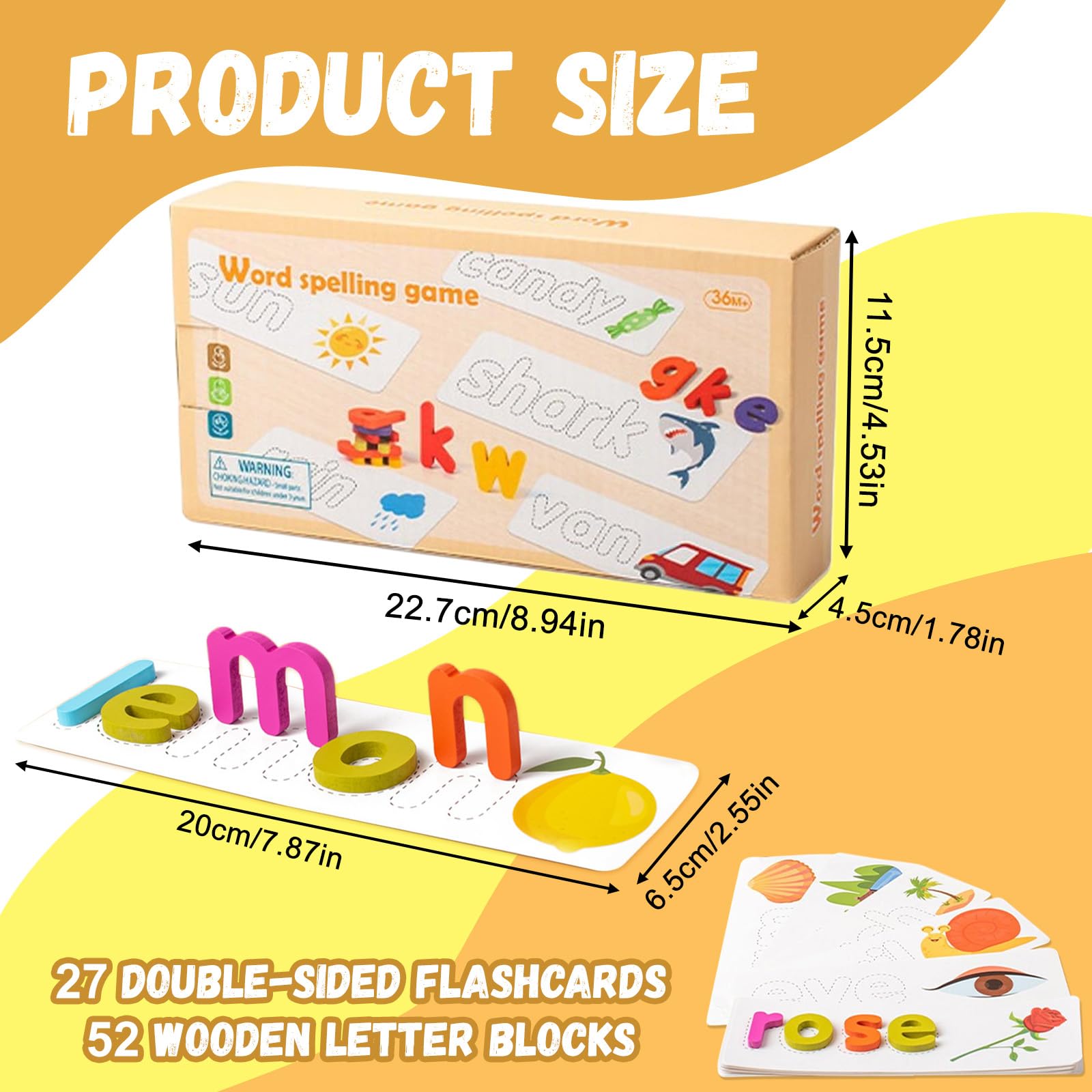 wadafen Spelling Games for Kids, Matching Letter Alphabet Puzzle Game with 27 Flash Cards and 52 Wooden Letters Blocks for boys and girls aged 3 and up, Preschool Vocabulary Spelling for Kids Toddlers