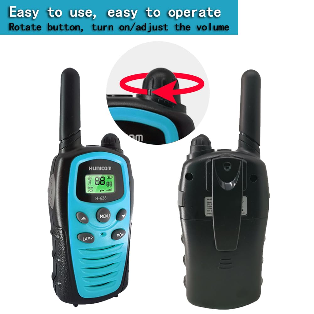 - HUNICOM walkie talkies use rotary buttons, which are large and easy to operate, making them suitable for adults, the elderly, and children to use. Stable performance, our walkie talkie is suitable for various work environments, including farms, forests, orchards, construction sites, gardens, etc. It can provide necessary communication assistance in various sports, mountain climbing, camping, and games. Stylish and beautiful appearance, it is a great gift choice for parents, friends, and children.