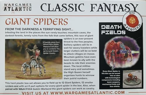 - This hard plastic box set allows you to field up to 12 Giant Spiders, 12 smaller spiders and with sci-fi part options for every giant spider in the box. Also, when paired with WAACF004 Goblin Warband (coming later this year) the giant spiders can work as cavalry.