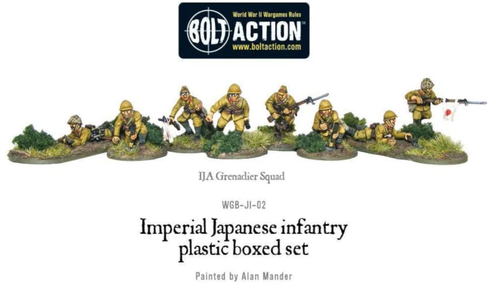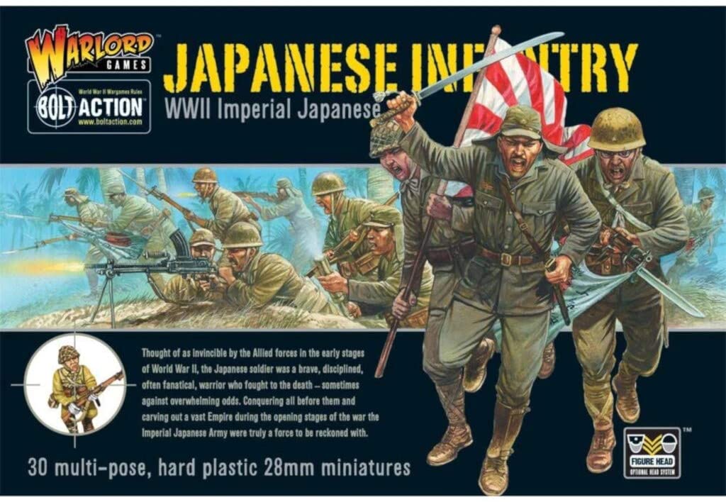 WWII Imperial Japanese Infantry – 28mm Hard Plastic Figures by Warlord GamesManufacturers Description: Thought of as invincible by the Allied forces in the early stages of World War II, the Japanese soldier was a brave, disciplined, often fanatical, warrior who fought to the death €ŸǏ sometimes against overwhelming odds. Conquering all before them and carving out a vast Empire during the opening stages of the war the Imperial Japanese Army were truly a force to be reckoned with. This plastic box set contains enough parts to make 30 plastic Japanese infantry armed with: Arisaka rifle Light ‘knee’ mortar Hand grenades Type 99 Light machine gun (and bayonet!) Type 14 Nambu pistol Flag pole NCO’s Shin Gunto sword Anti-tank lunge mine Arisaka rifle with bayonet Type 100 sub-machine gun Plus lots of accessories including a bugle and full-colour devotional banner and flag sheet! MODEL KIT REQUIRES ASSEMBLY AND PAINTING. GLUE AND PAINT NOT INCLUDED. RECOMMENDED AGE: 14+