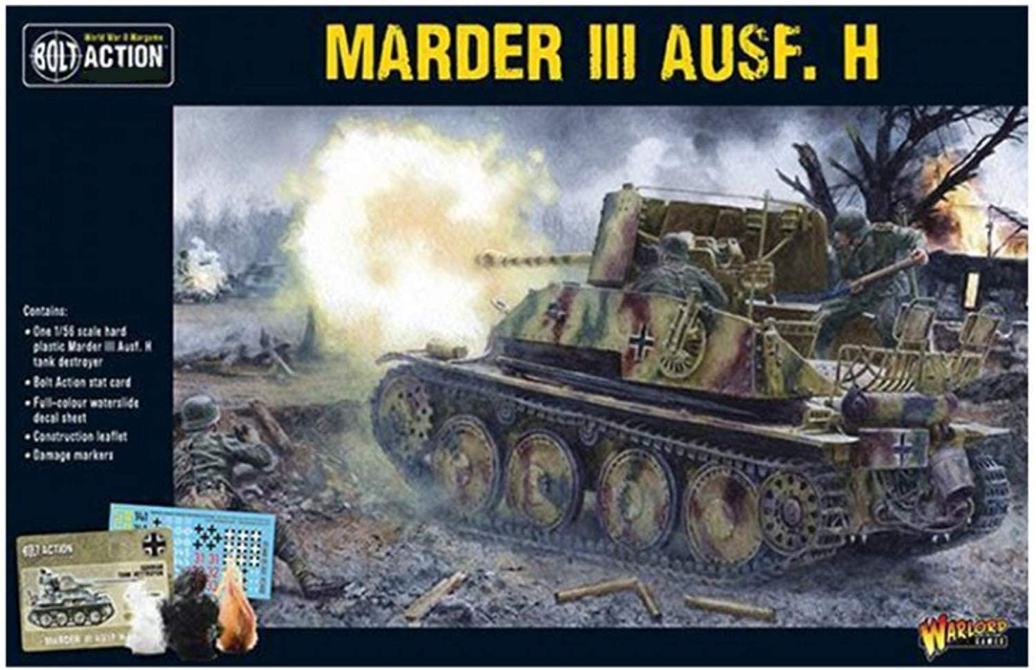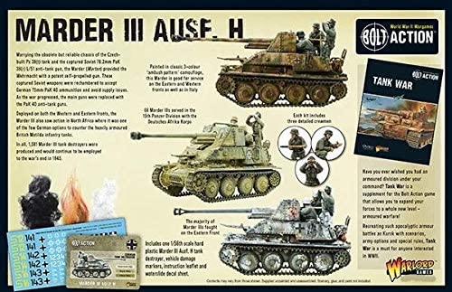 Marrying the obsolete but reliable chassis of the Czech-built Pz 38(t) tank and the captured Soviet 76.2mm PaK 36(r) L/51 anti-tank gun, the Marder (Marten) provided the Wehrmacht with a potent self-propelled gun. These captured Soviet weapons were rechambered to accept German 75mm PaK 40 ammunition and avoid supply issues. As the war progressed, the main guns were replaced with the PaK 40 anti-tank guns. This box set contains: A 1/56th scale hard plastic Marder III Ausf. H tank destroyer Bolt Action stat cards Full-colour waterslide decal sheet Vehicle damage markers An instruction leaflet Deployed on both the Western and Eastern fronts, the Marder III also saw action in North Africa where it was one of the few German options to counter the heavily armoured British Matilda infantry tanks. In all, 1,581 Marder III tank destroyers were produced and would continue to be employed to the warÕs end in 1945.