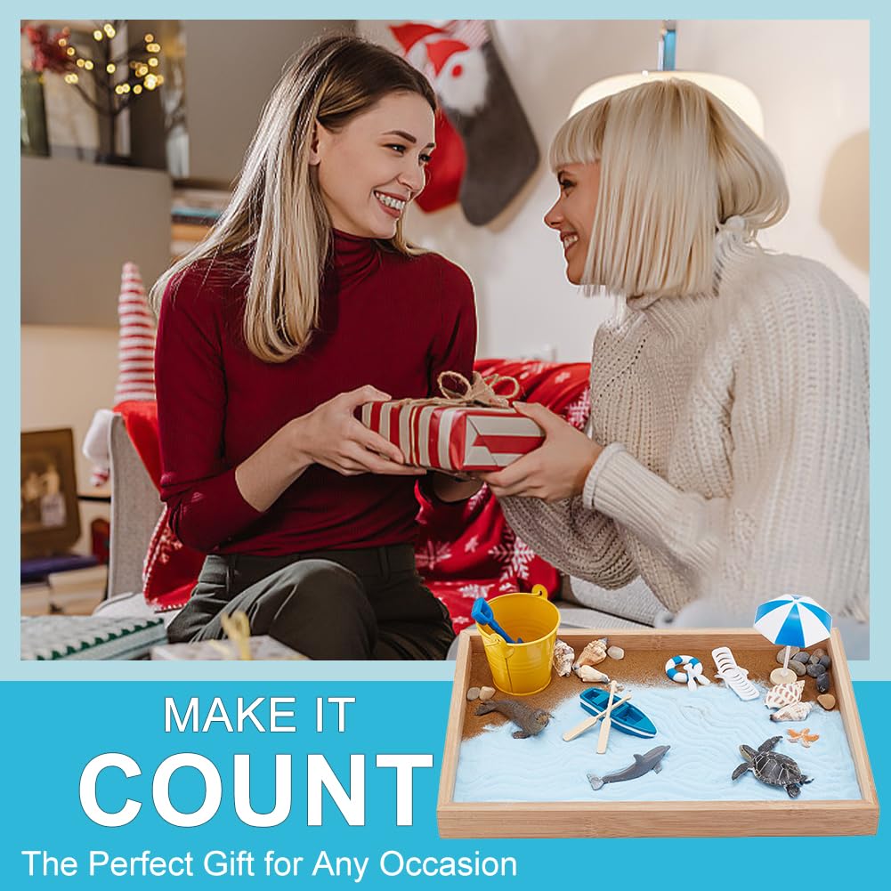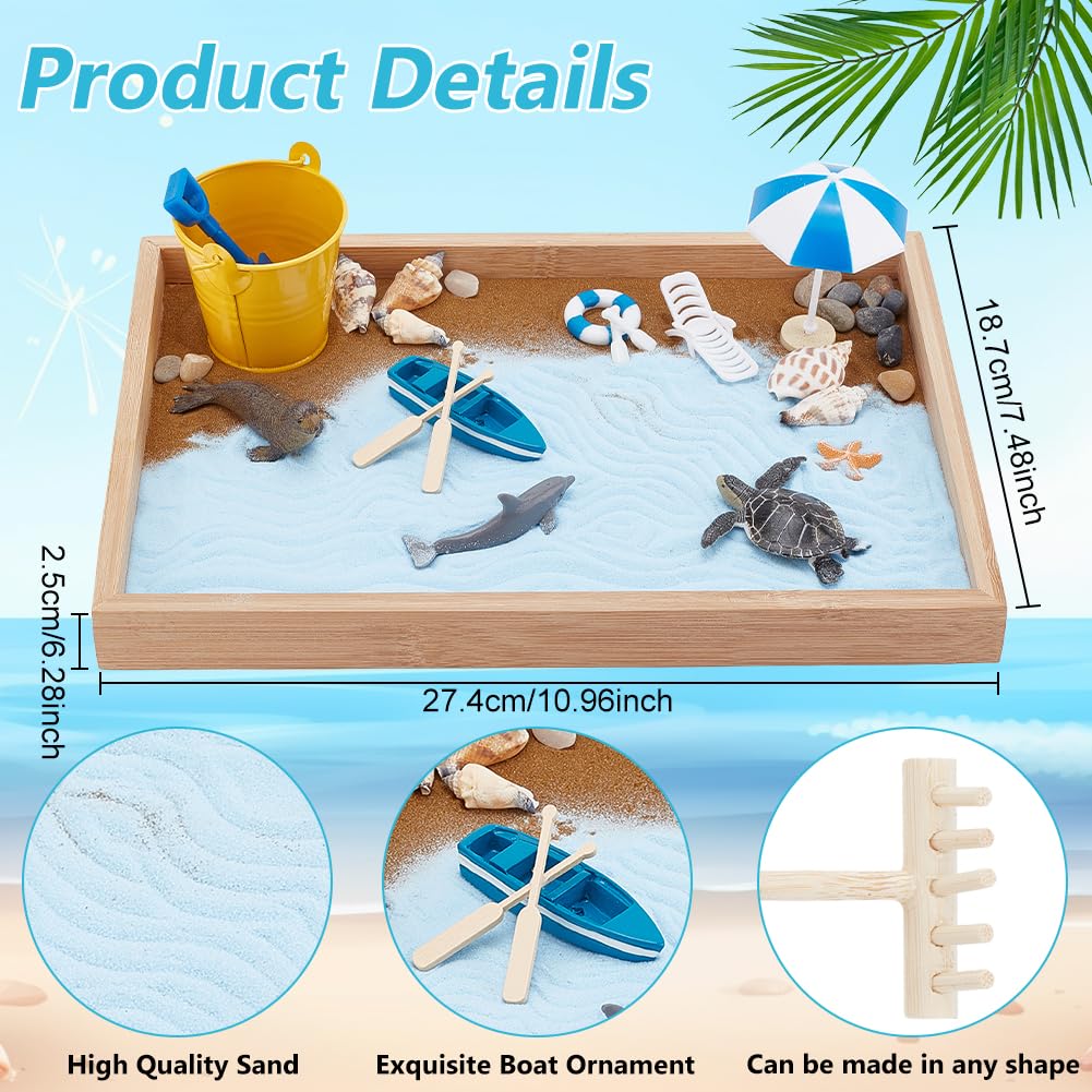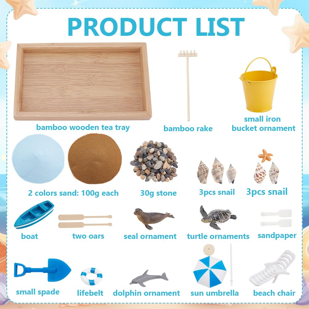 - Beach-inspired summer theme: Each zen garden comes as a complete kit and ready for you creation: bamboo tray,colored sand,conch,simulated marine animaland other various ornaments,simulation plants,etc.