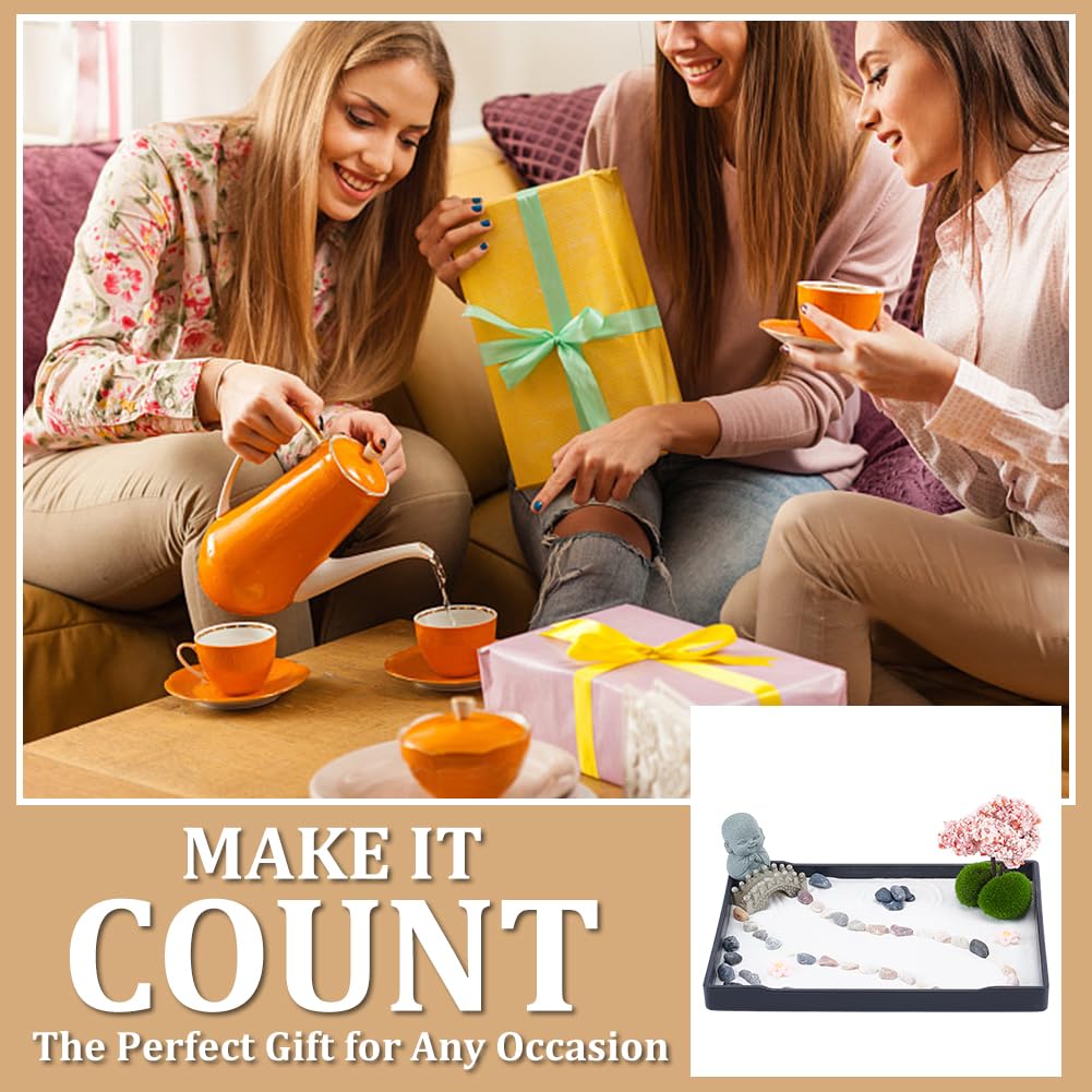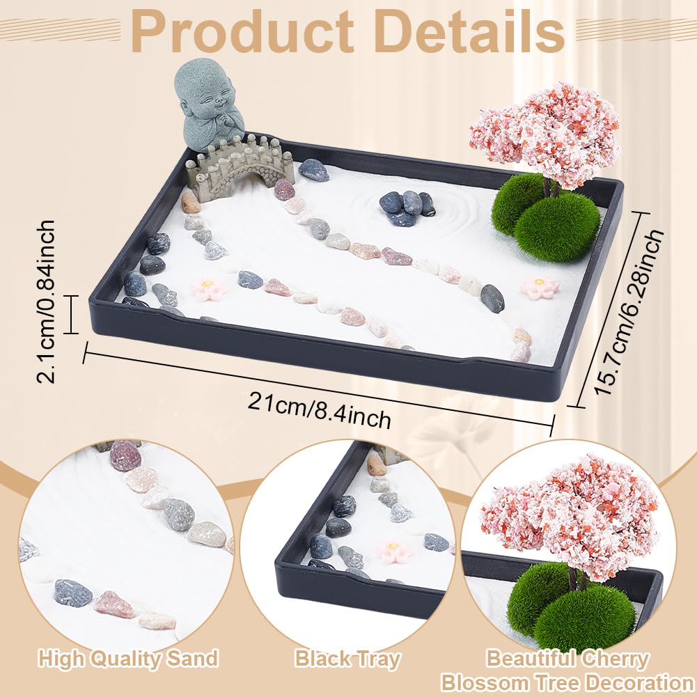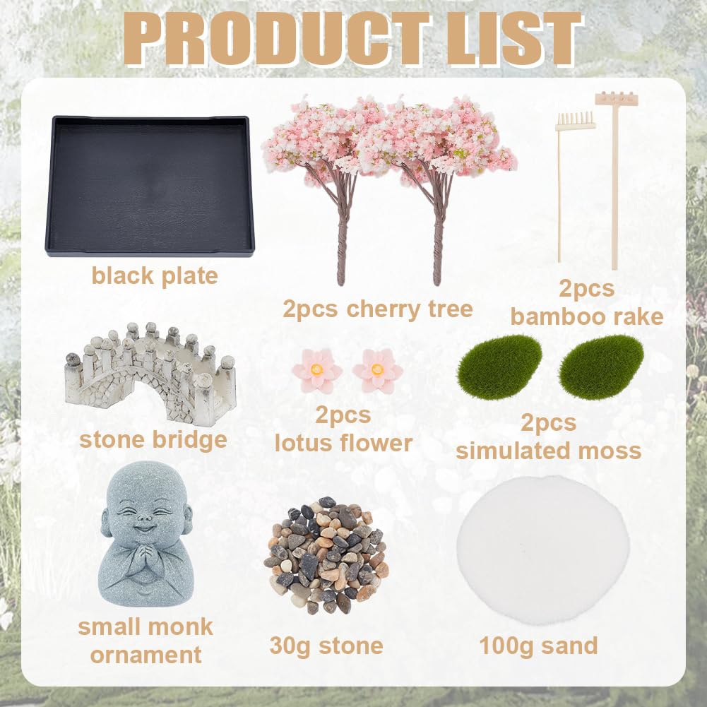 This sandbox set is Japanese style with sand, stones, simulated mini trees, various decorations and simulated plants to create a lively landscape.