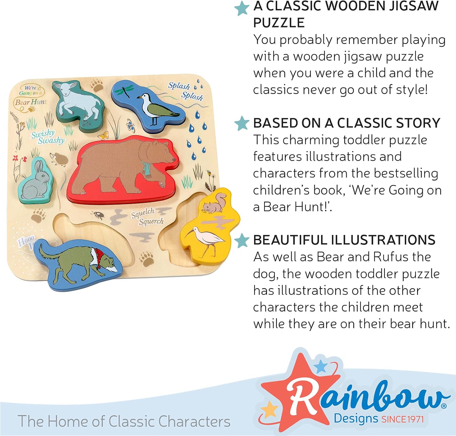 - BEAUTIFUL ILLUSTRATIONS: As well as Bear and Rufus the dog, the wooden toddler puzzle has illustrations of the other characters the children meet while they are on their bear hunt. Encourage your tot to name the animals and read the phrases as they play with the animal puzzle.