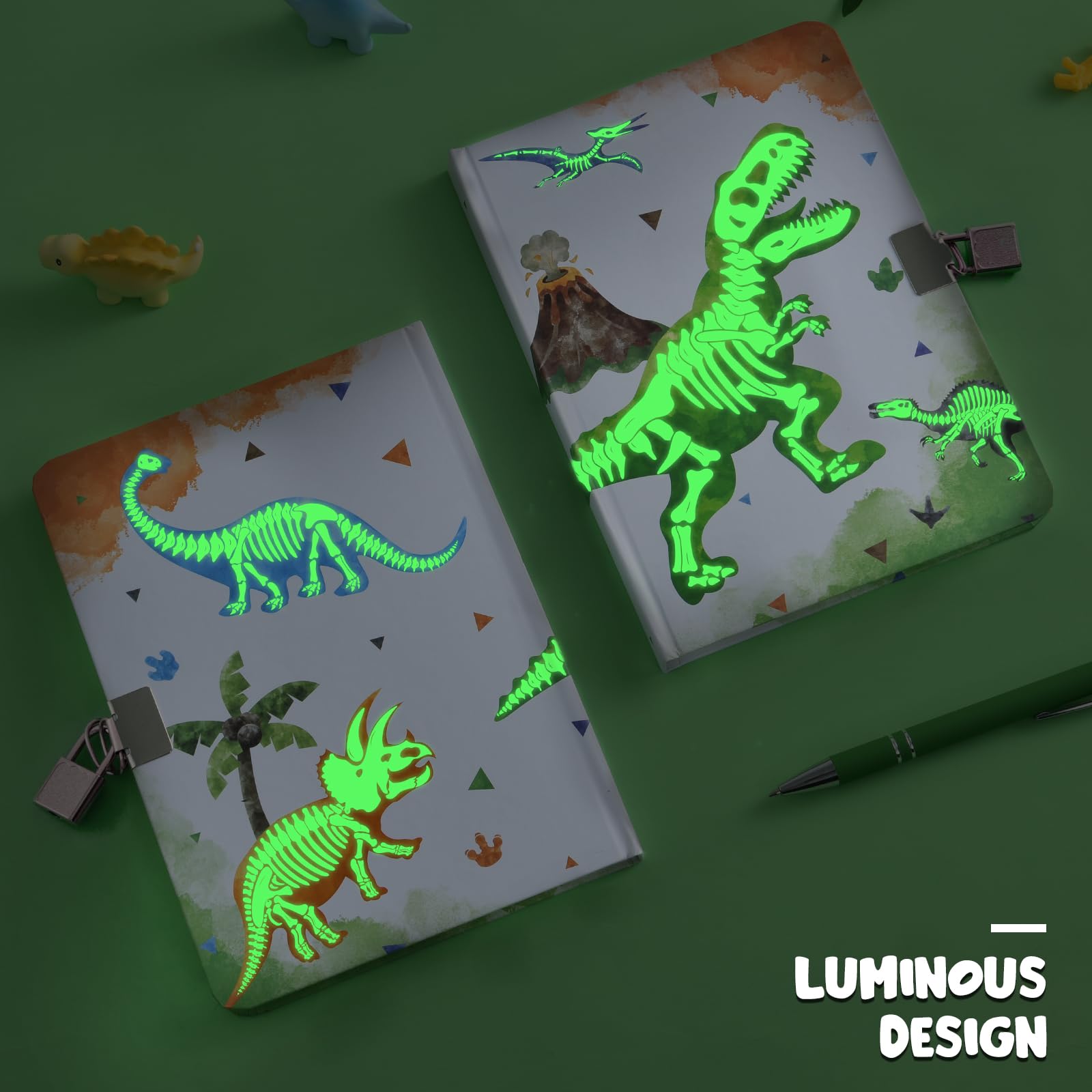 - LUMINOUS DESIGN: Every dinosaur on the notebook has its color in the daytime. And when they absorb enough light, their skeletons will glow in the dark. Every boy wants such a cool notebook!
