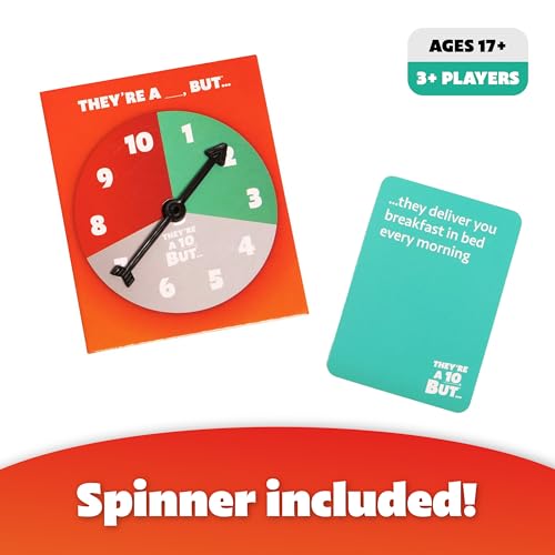 Ten out of Ten: This is the rate-a-date card game based on the viral TikTok trend! NSFW: This party game is for players ages 17 and up. Play with 3 or more friends. How To Play: Start the game by spinning the spinner to get your imaginary date’s baseline hotness, and then pair it with a trait card. All players share their ratings (and defend their taste!) Anyone whose answer matches the judges wins a point. What’s Inside: Includes 1 spinner, 300 trait cards, and instructions. More Fun: Brought to you by What Do You Meme? Check out our full collection of fun stuff for adults, kids, and families.