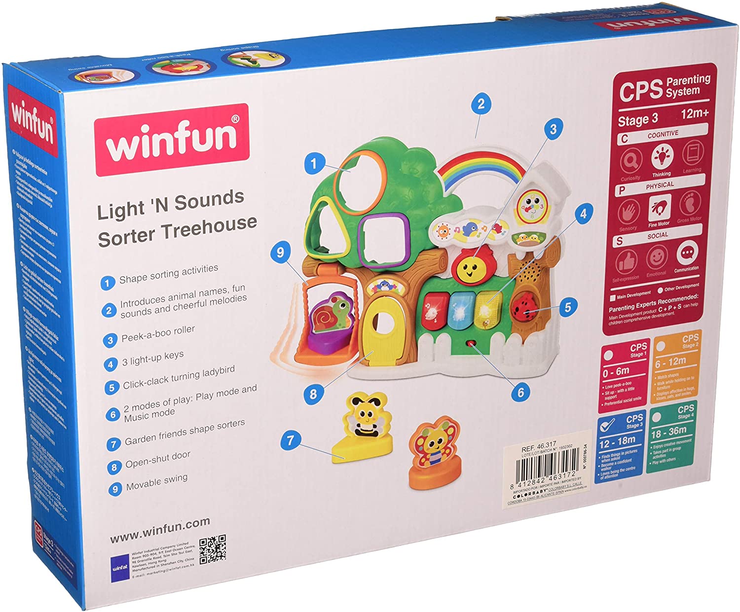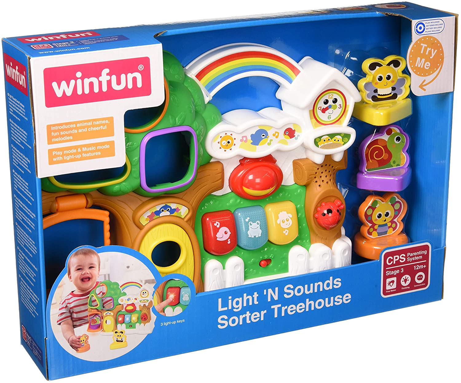 The fun is guaranteed at the WinFun Tree House. With its new little friends your baby will spend it big while learning sounds, melodies, colors, shapes and animals. The house is formed by a large tree in which the cup has 3 geometric hollows of colors with which you can associate the mobile figures of the bee, snail and butterfly to play insert. It also has a door that opens and closes and a fun swing on which to swing the animals. The house features an ON/OF button with volume control and 3 coloured buttons that illuminate and with which you will learn animal names, entertaining sounds and cheerful melodies. The ladybird makes “click-clack” when moving, the smile face will go to sleep if the tour and the rainbow is a handle to take the Tree House everywhere. This activity centre is suitable for boys and girls between 12 and 18 months. With it, the little ones develop imagination, global motor skills, learning, language and understanding cause – effect. The toy is powered by 2 x AAA batteries (included).