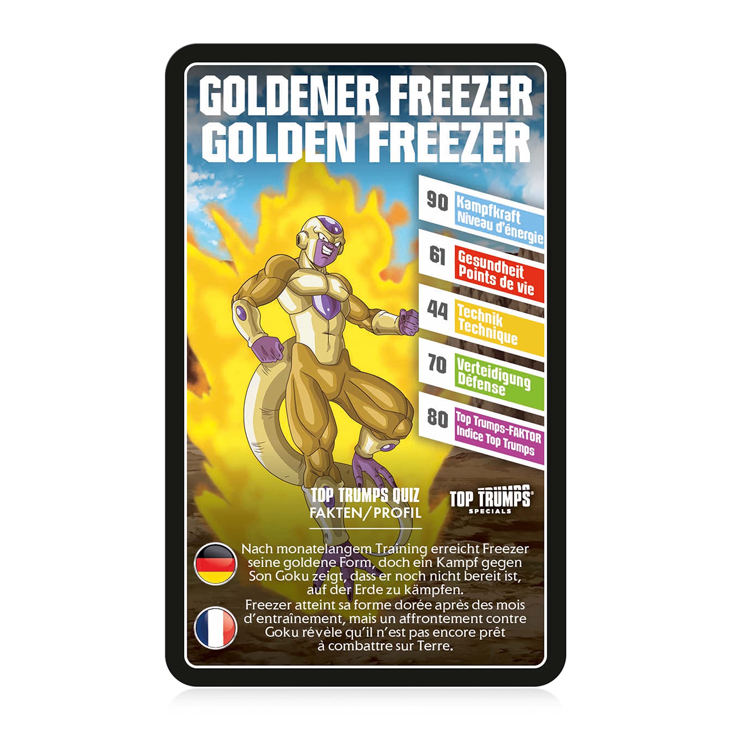 Vegeta, Son Goku and Co. – If you know these names, you can enjoy the Top Trumps Dragon Ball Super! In this card game you can discover the most diverse characters of the popular TV series on 30 character cards and let them compete against each other in five categories. The special feature of this top trumps: it is available as a bilingual version in German and French.