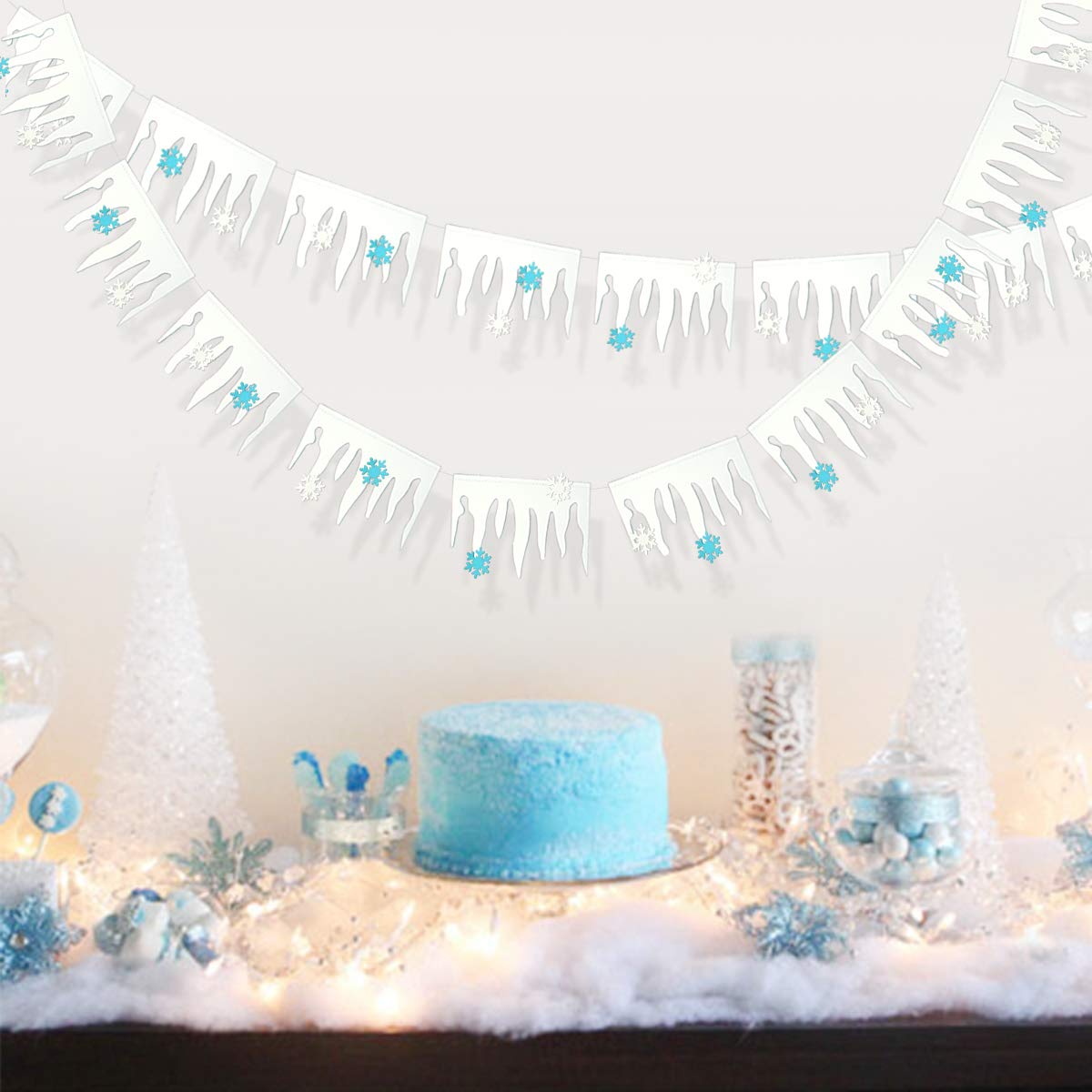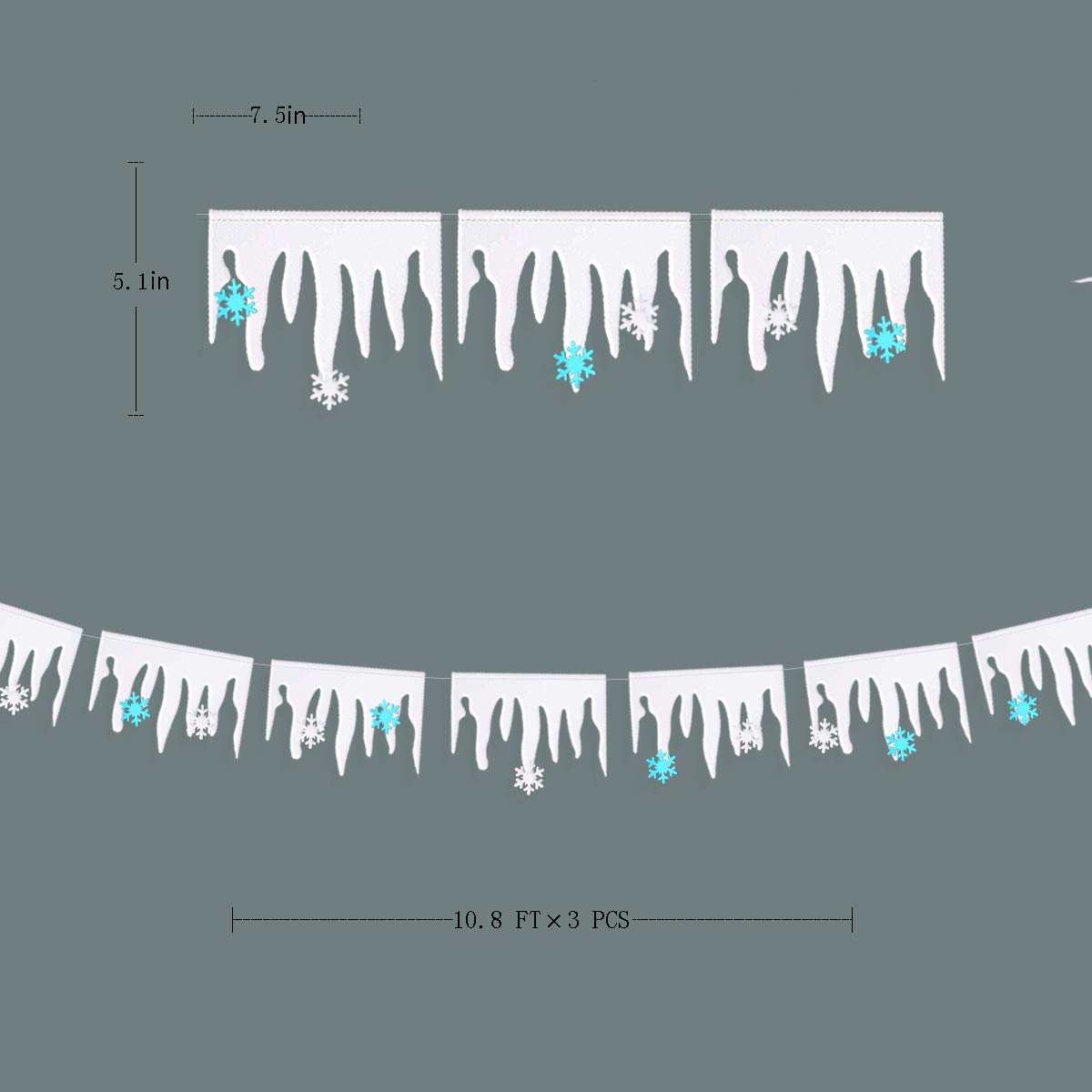 - SIZE AND UNIQUE DESIGN- These Christmas icicle banners each string is 3 meters with 12 pieces icicle,total length of banner-9m/30ft.It comes with 24 pcs additional little snowflake in blue and 24 in white! Perfect for xmas frozen winter party decorations to create magical festive atmosphere for your friends and family!