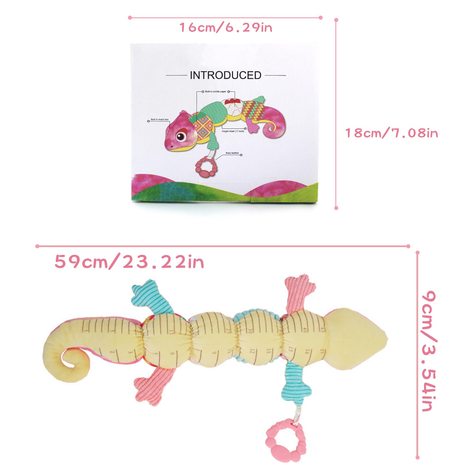 - 4 IN 1 Baby Activity Toys – Combines the fun of early learning pattern toys, Musical toys, Rattle toys, Animal plush toys into this toy. Providing an all-around sensory experience for babies on a Chameleon toy.