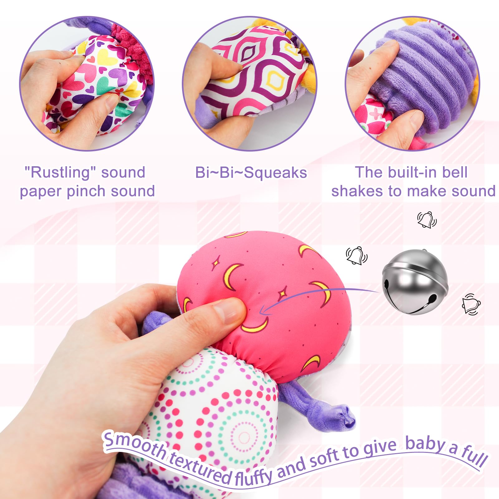 - [Multi-sensory Experience]With the built-in music box, BB device, crinkle paper, and rattle bell, it can greatly attract babys attention, and develop their cognitive ability.
