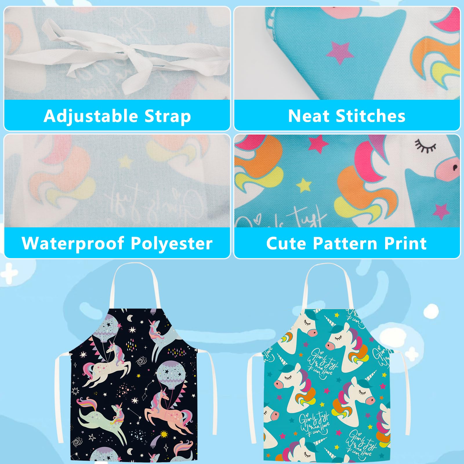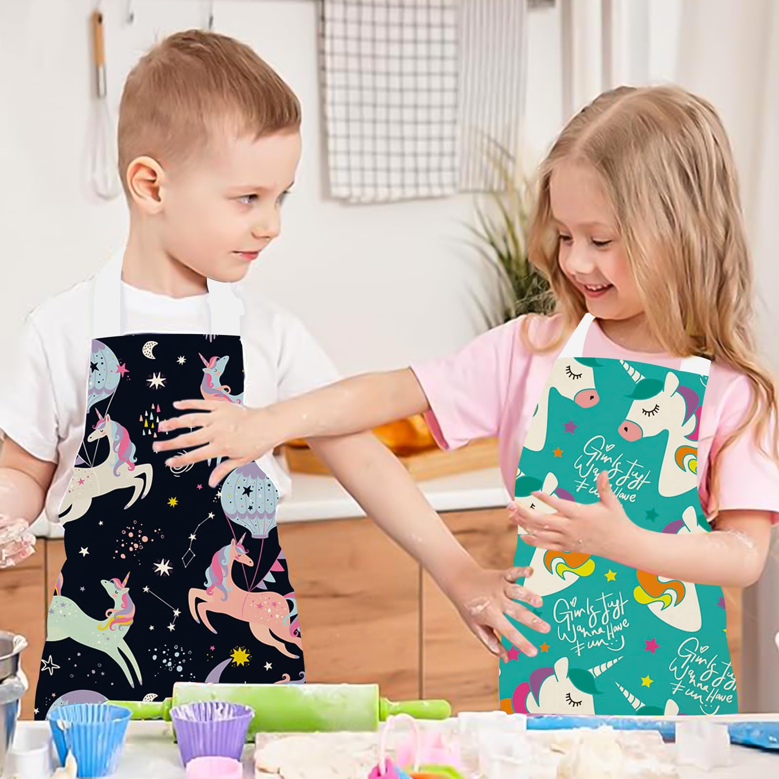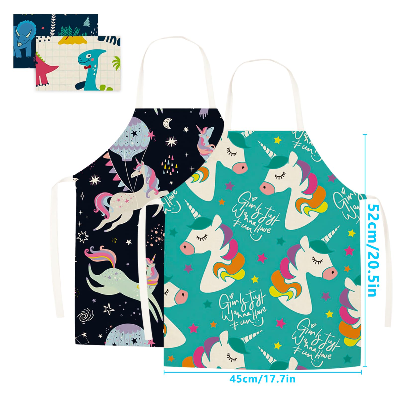 Wolepaz 2 Pcs Kids Aprons, Cartoon Style Adjustable Child Chef Aprons, Linen Unicorn Horse Aprons for Boys Girl’s Kitchen Cooking Baking Painting Wear(Green+Blue)