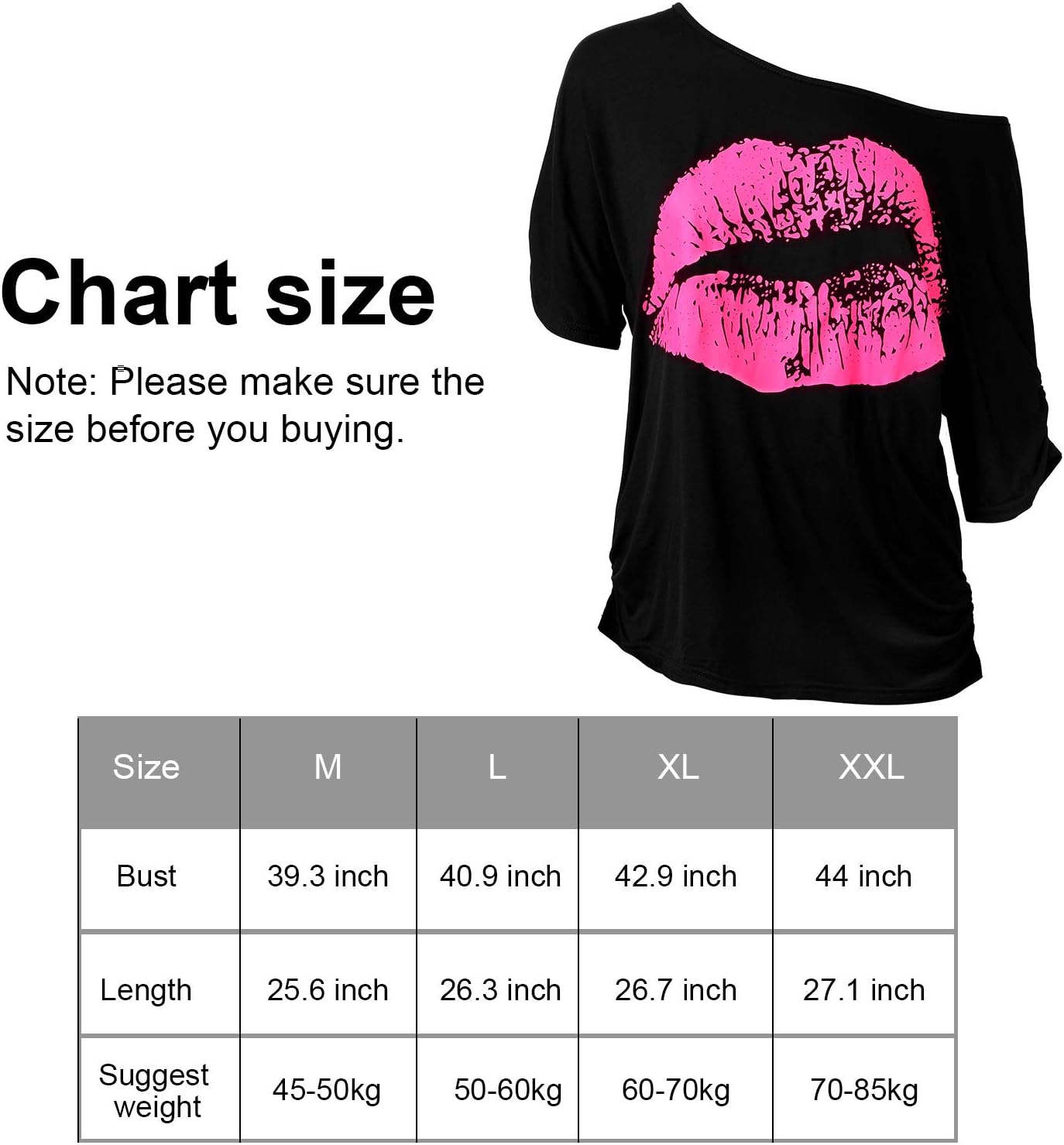 - Size: the lips printed t-shirt include small(S): 37.80 inch in bust, 25.20 inch in length; Medium(M): 39.3 inch in bust, 25.6 inch in length; Large (L): 40.9 inch in bust, 26.3 inch in length; X-Large(XL): 42.9 inch in bust, 26.7 inch in length; XX-Large(XXL): 44.0 inch in bust, 27.1 inch in length; XXX-Large(XXXL): 45.67 inch in bust, 27.56 inch in length; The kind of fabric has enough elasticity