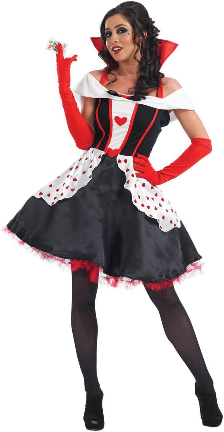 - HIGH QUALITY WOMENS CLASSIC BOOK CHARACTER QUEEN COSTUME: Outfit contains a high-collared red white and black dress and matching black hold ups