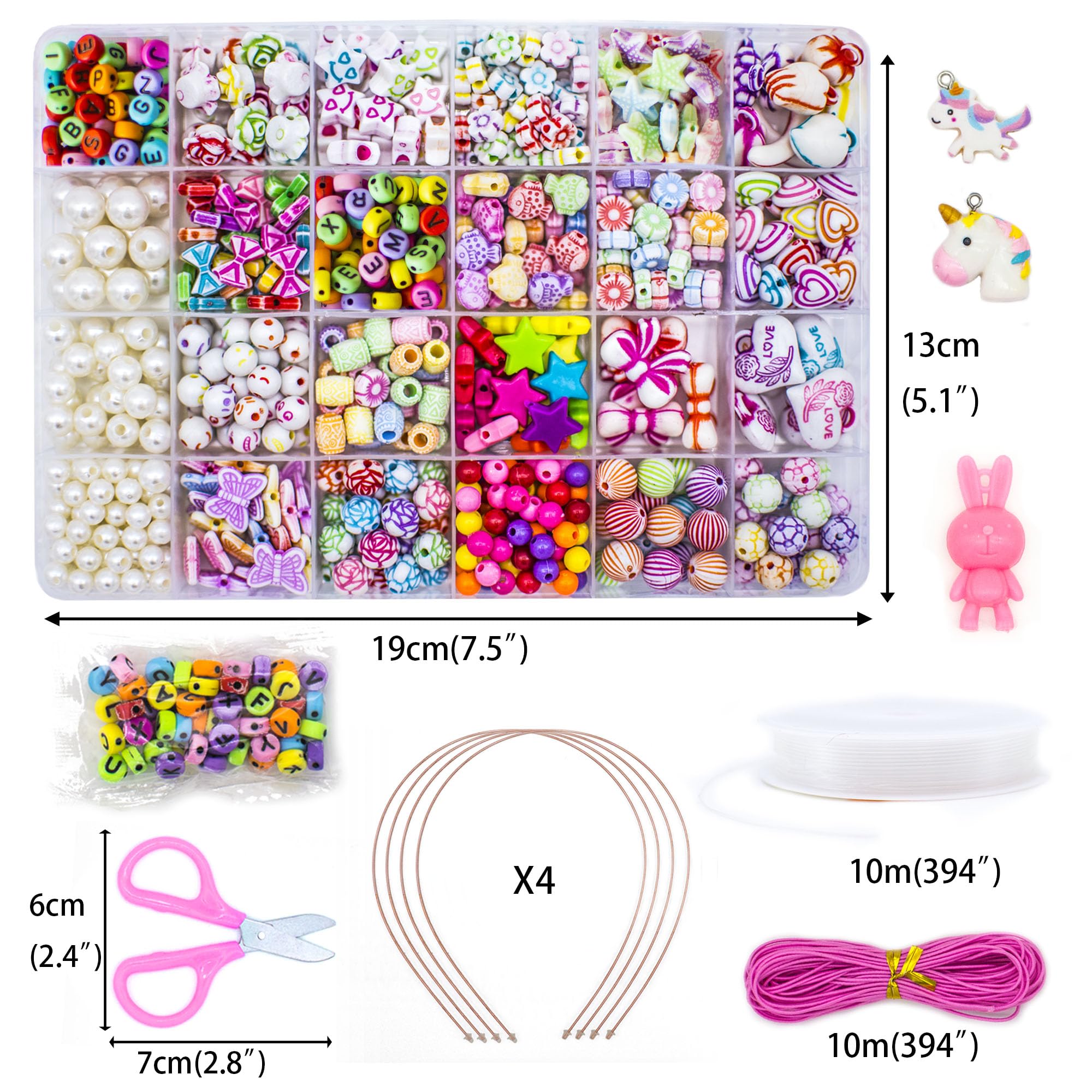 - Jewelry Making Accessories Include — Crystal elastic line, Elastic Cord, Safety scissors for children, Alphabet replacement beads, 3 hair hoods and pendant accessories.