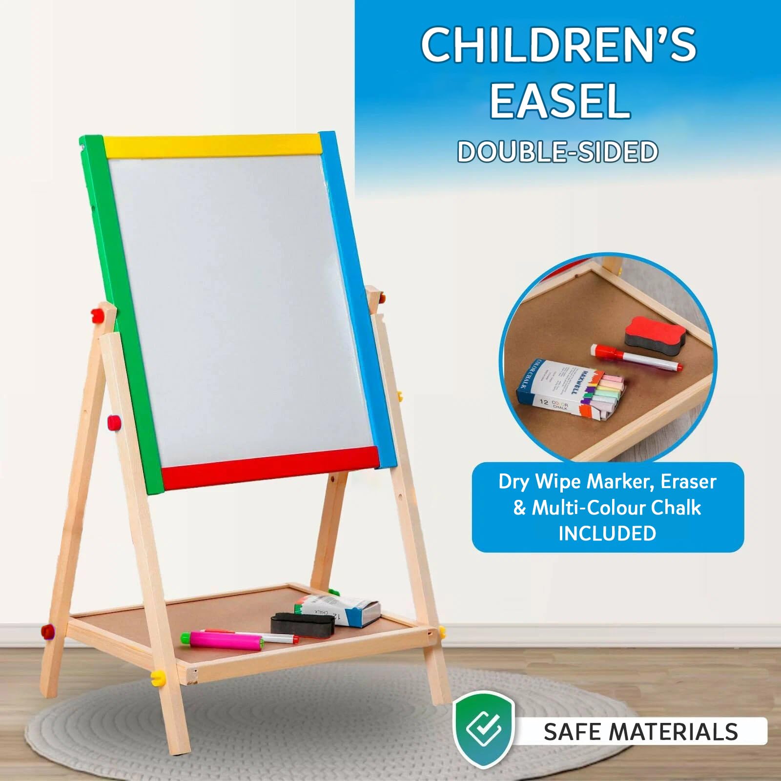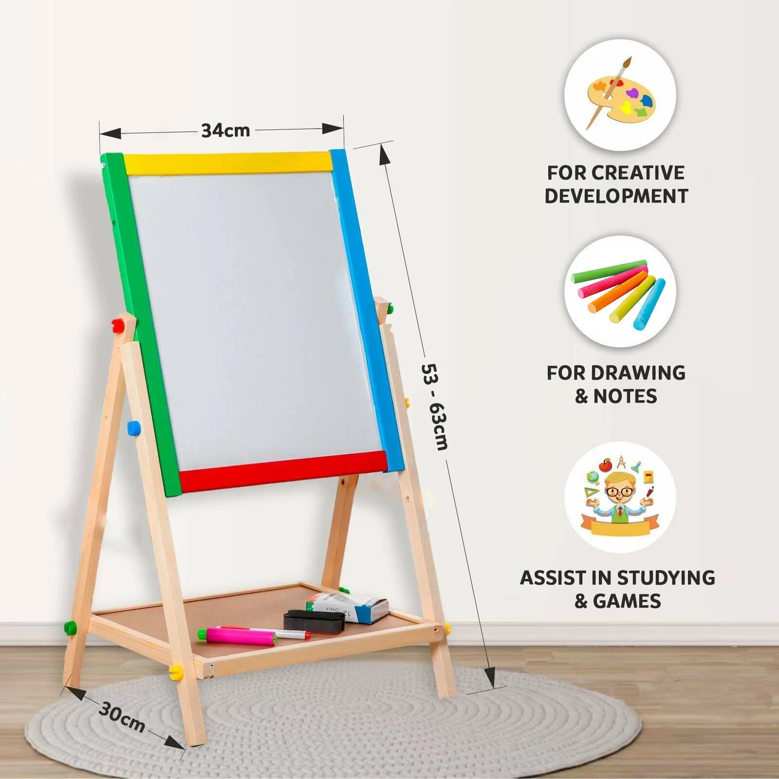 - ADJUSTABLE HEIGHT & PORTABLE BOARD: With two height settings (53cm or 63cm) and a removable board perfect for table, floor, or lap use, this childrens easel grows with your toddler and adapts to any play space.