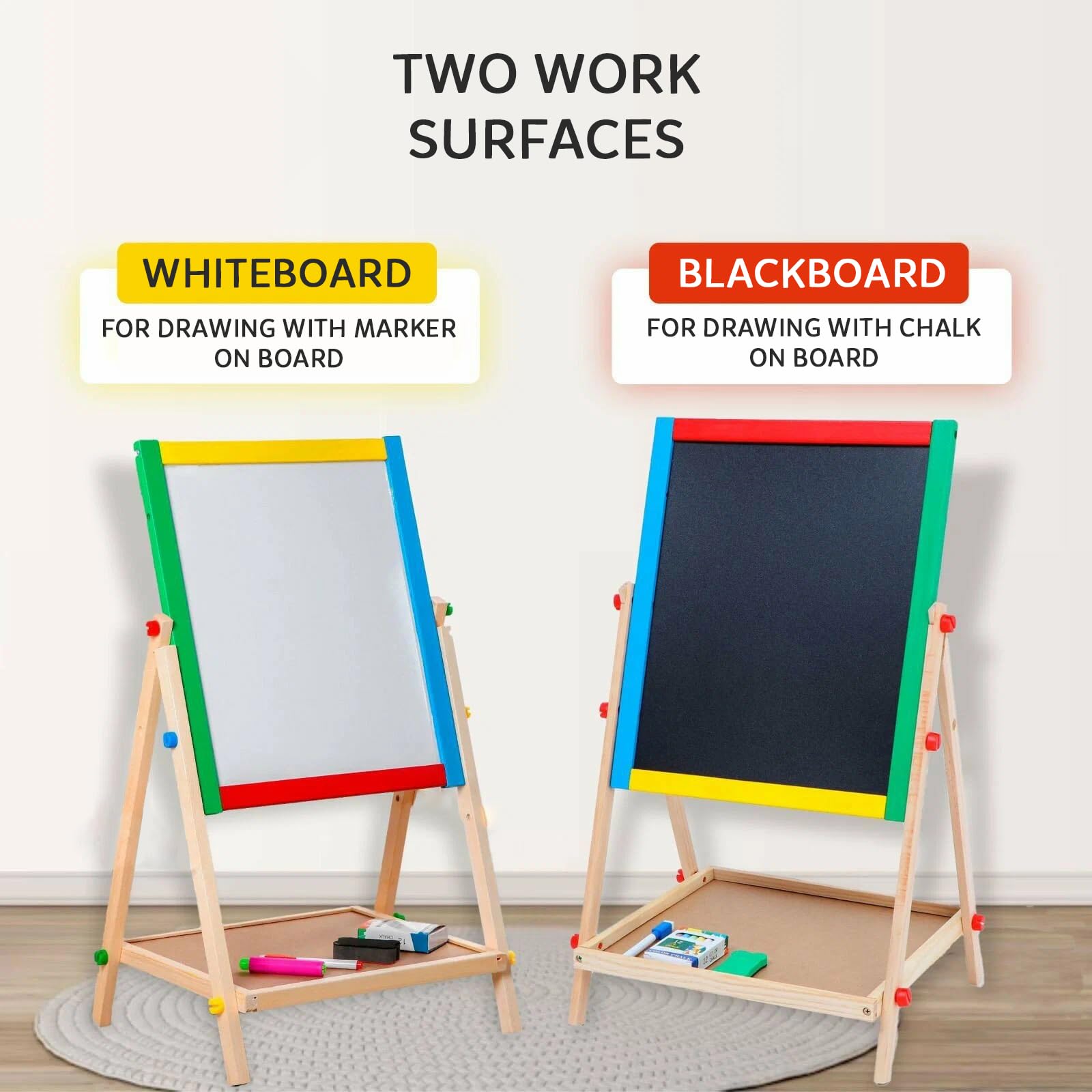- DOUBLE-SIDED DESIGN FOR CREATIVE VARIETY: This child easel for kids features a double-sided blackboard and magnetic drawing board, offering a chalkboard on one side and a whiteboard with stand on the other for endless fun.