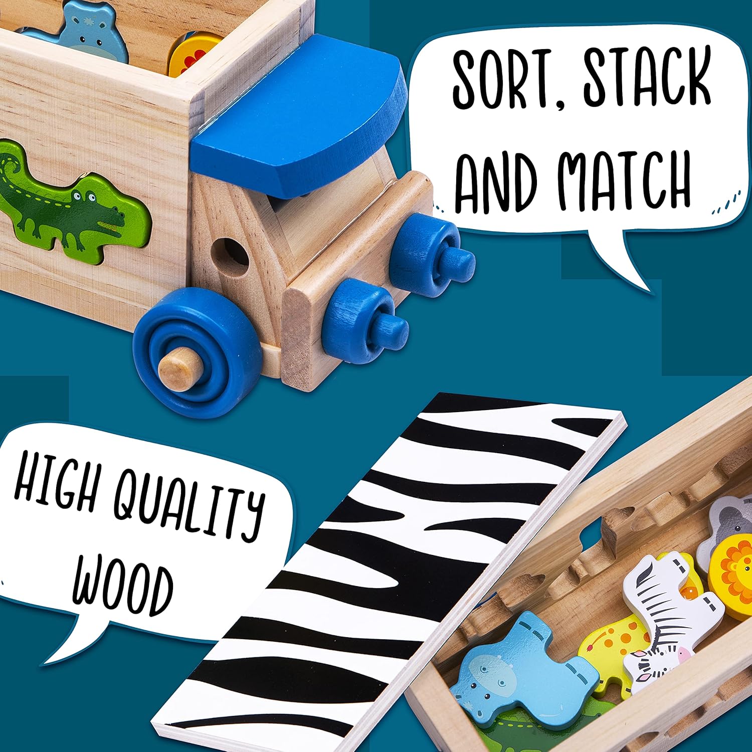- Wooden Toys | The baby wooden toys includes 6 wooden Animals a zebra, an alligator, a lion, a giraffe, a hippo, an elephant and a wooden shape sorter, toy truck. The small animal toys slot in the pull along toys truck toy which has a removable roof.