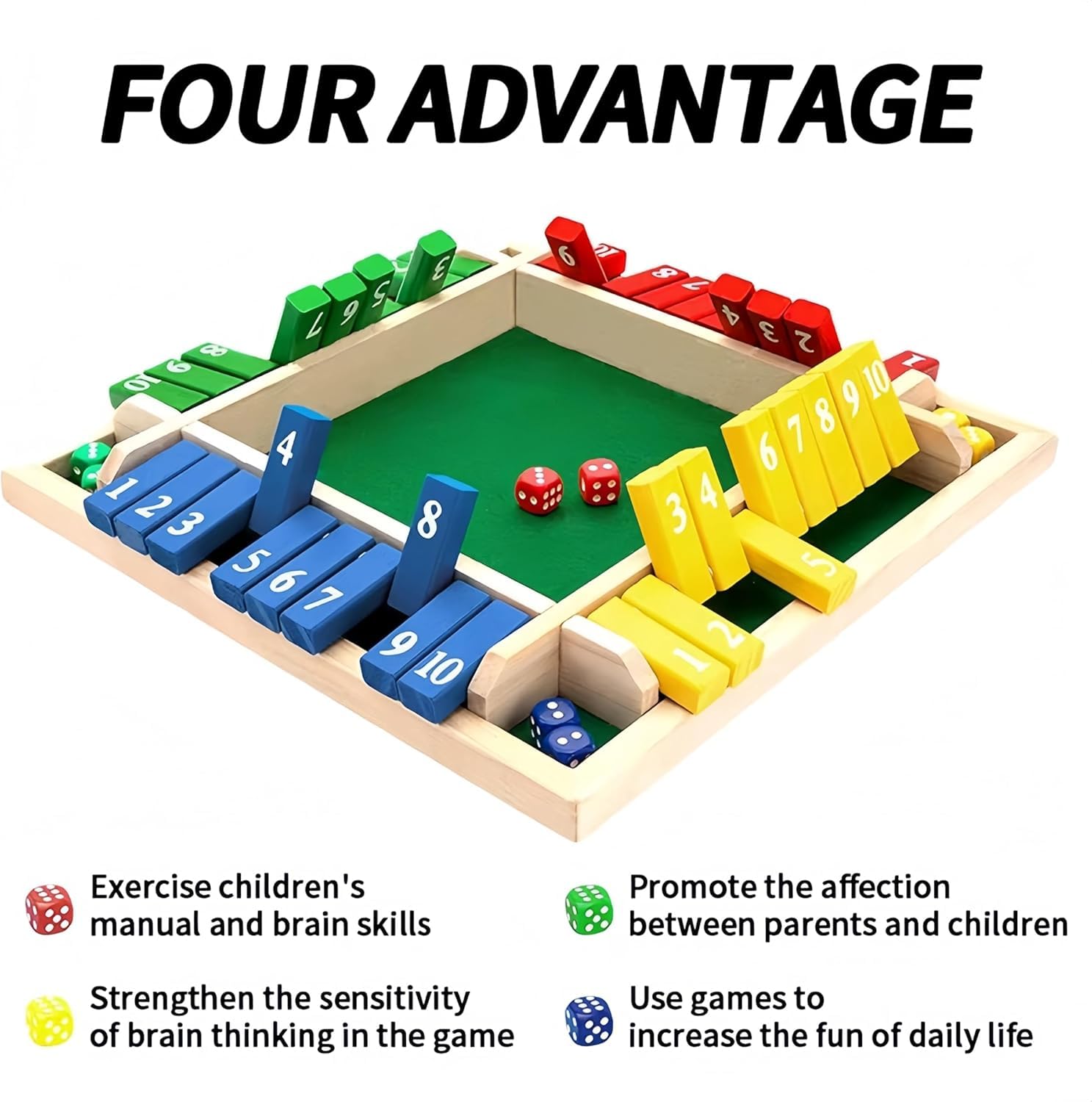 The game includes 8 colourful dice and numbered flip-down tiles in vibrant yellow, green, red, and blue sections – one for each player.