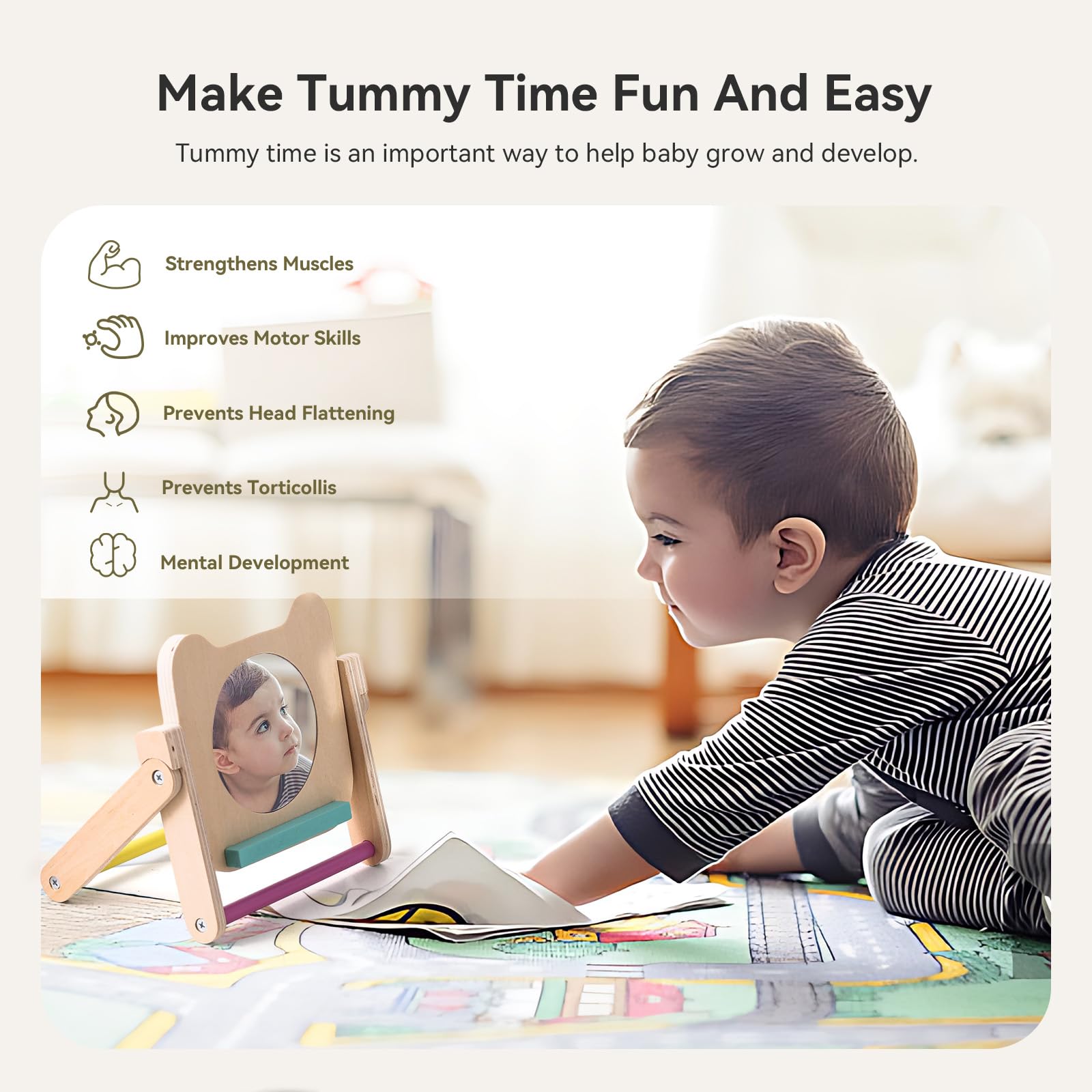 - Promotes Development – Our baby mirror toy significantly supports your baby’s motor, visual, and sensory skills during tummy time. This versatile toy promotes visual and physical development through the practice of following reflections
