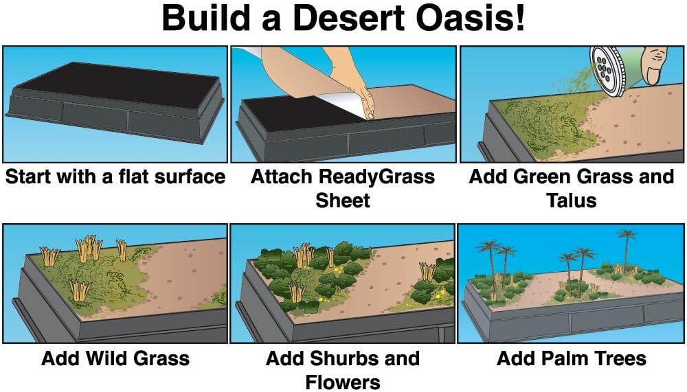 Woodland Scenic-Diorama Kit: Desert Oasis. The Ideal start to creating any type of flat sandy or barren surface for dioramas. This 9-1/2×11-1/4×3 inch package contains one bag of talus one 0.017oz bag of wild grass one bag of yellow flowers one bag of green grass one 10-3/4×16-1/4 inch desert sand Ready Grass Vinyl mat foliage fiber material one spray bottle one 1oz bottle of project glue one 0.5oz jar of sticky bond one foam brush one stir stick one plastic cup and shifter lid five palm trees and instructions. Recommended for ages 7 and up. Warning: Choking Hazard-small parts. Not for children under 3 years. Conforms to ASTM D 4236. Made in USA.