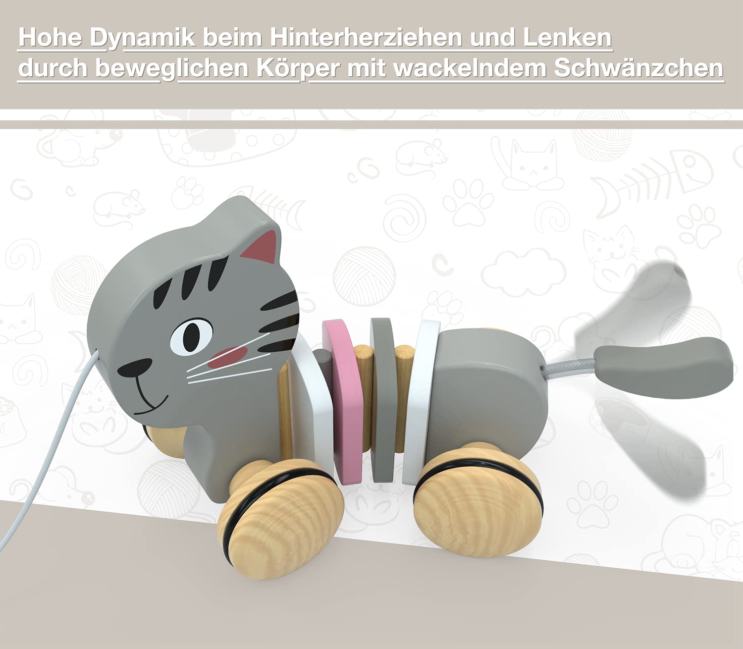 - Motor game with 12 months for children and children the cat has a height of 14.5 cm and a length of 25 cm. The colourful elements in the middle of the cat move when pulling behind and allow dynamic pulling with quick change of direction without the cat tipping over.