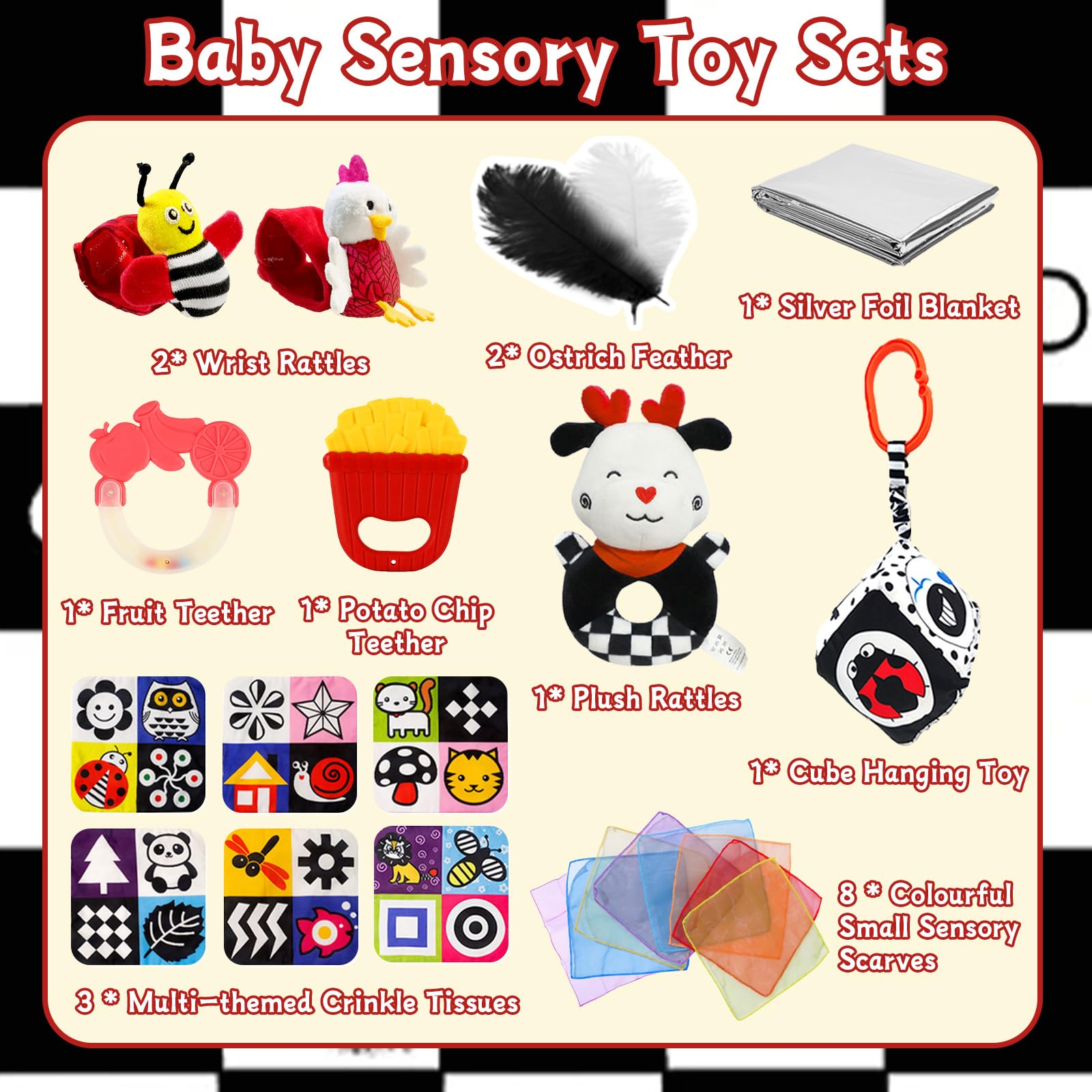 1. Our carefully crafted 20-piece black and white sensory toys are suitable for babies aged 0, 3, and 6 months. Our set has rich accessories and bright colors, which can promote the all-round development of baby’s vision, hearing, and touch!