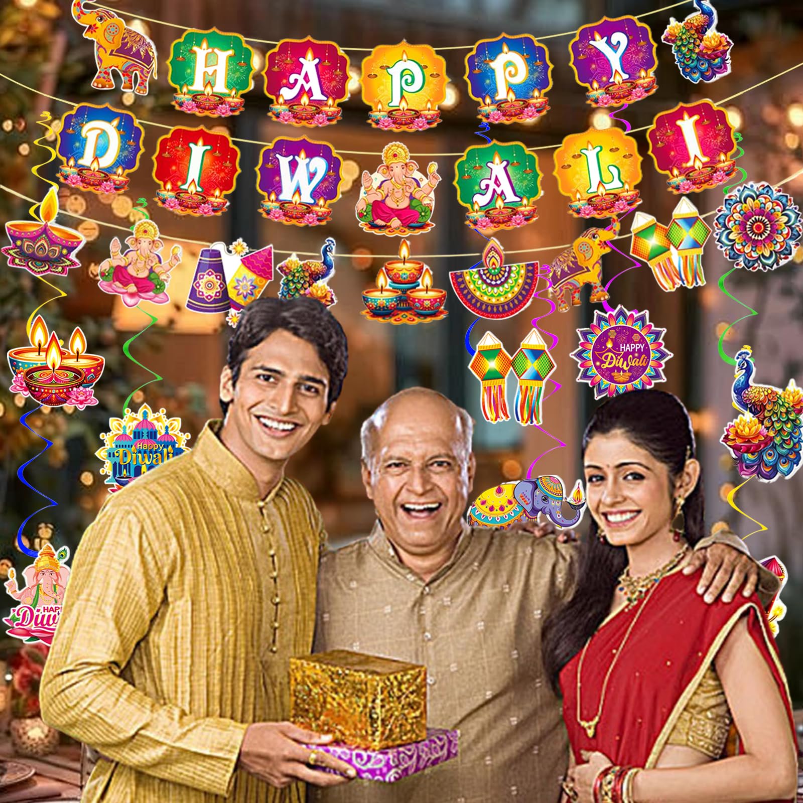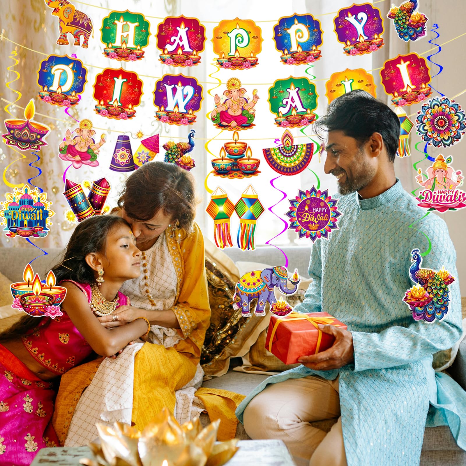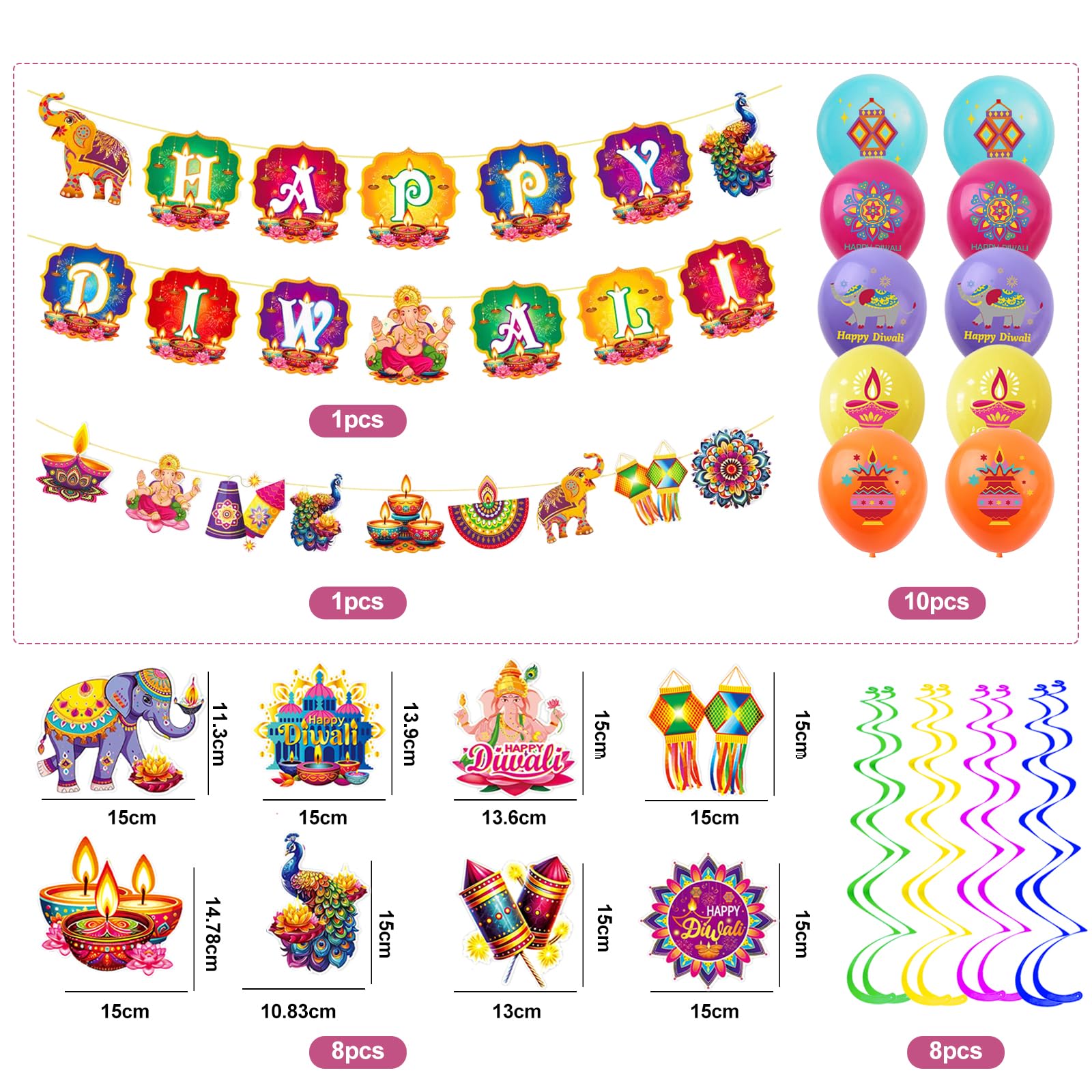 8 Hanging Swirl Decorations with Diwali-themed cutouts (oil lamps, peacocks, elephants, mandalas, and more)
