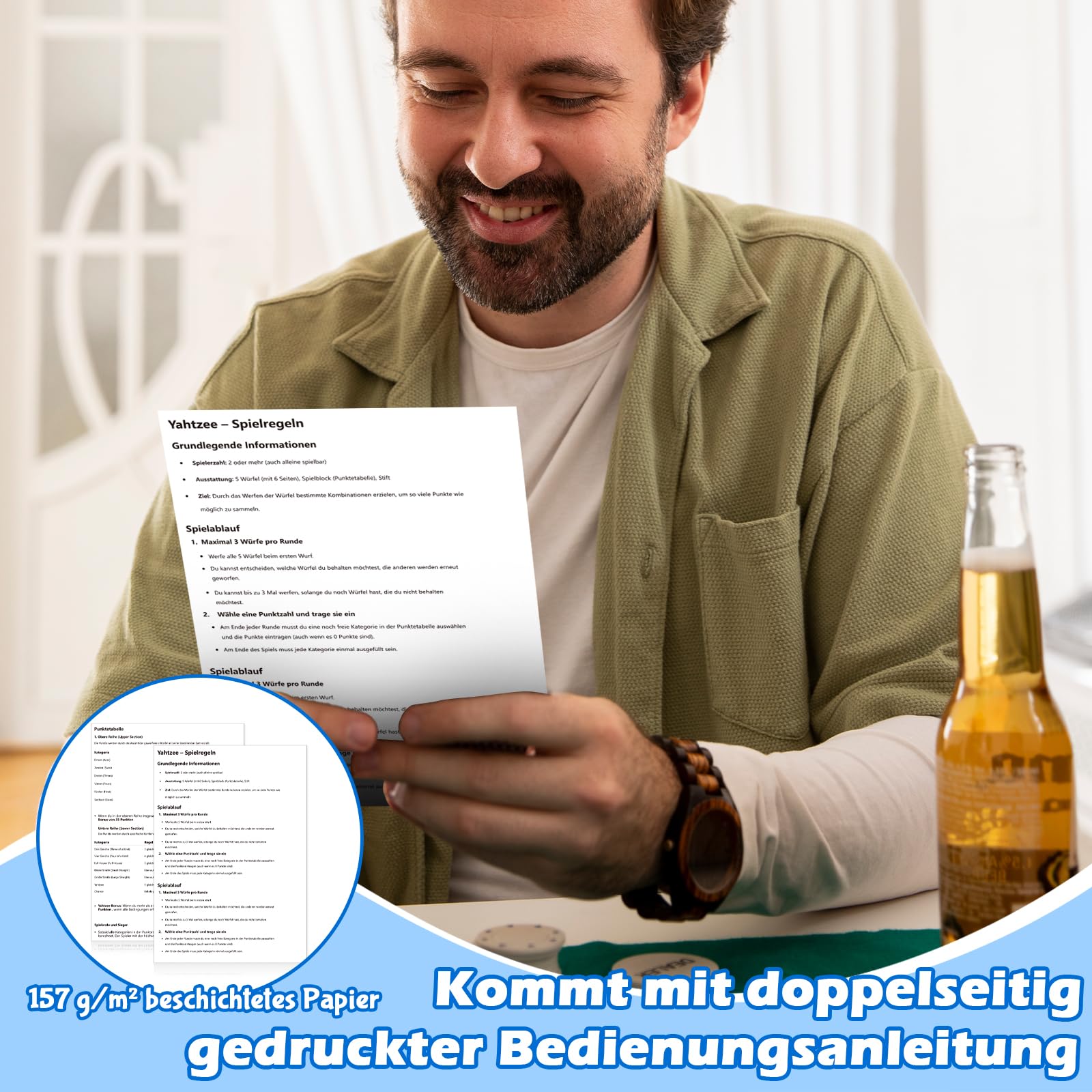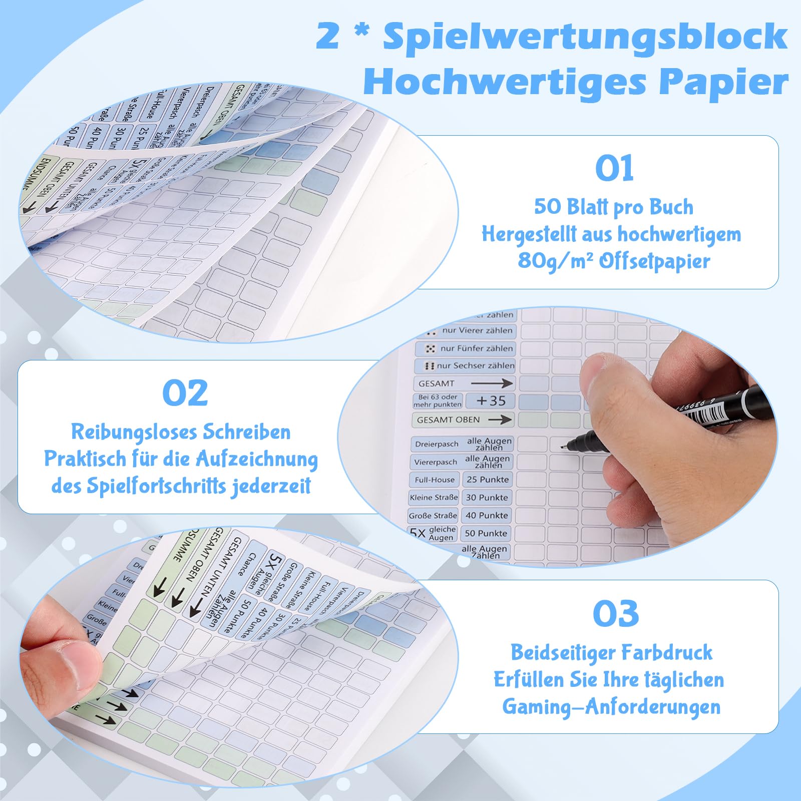 • HIGH QUALITY PRINTING & HIGH QUALITY MATERIAL All counting blocks are made of 80g double sided offset paper in color printing. This not only looks good, but is also durable and clearly records the results of each game round. The Gram and Speedboat Dice instructions are made of 157g thick coated paper with premium texture and comfortable feel. The blue flannel design of the dice tray provides an elegant gaming experience.