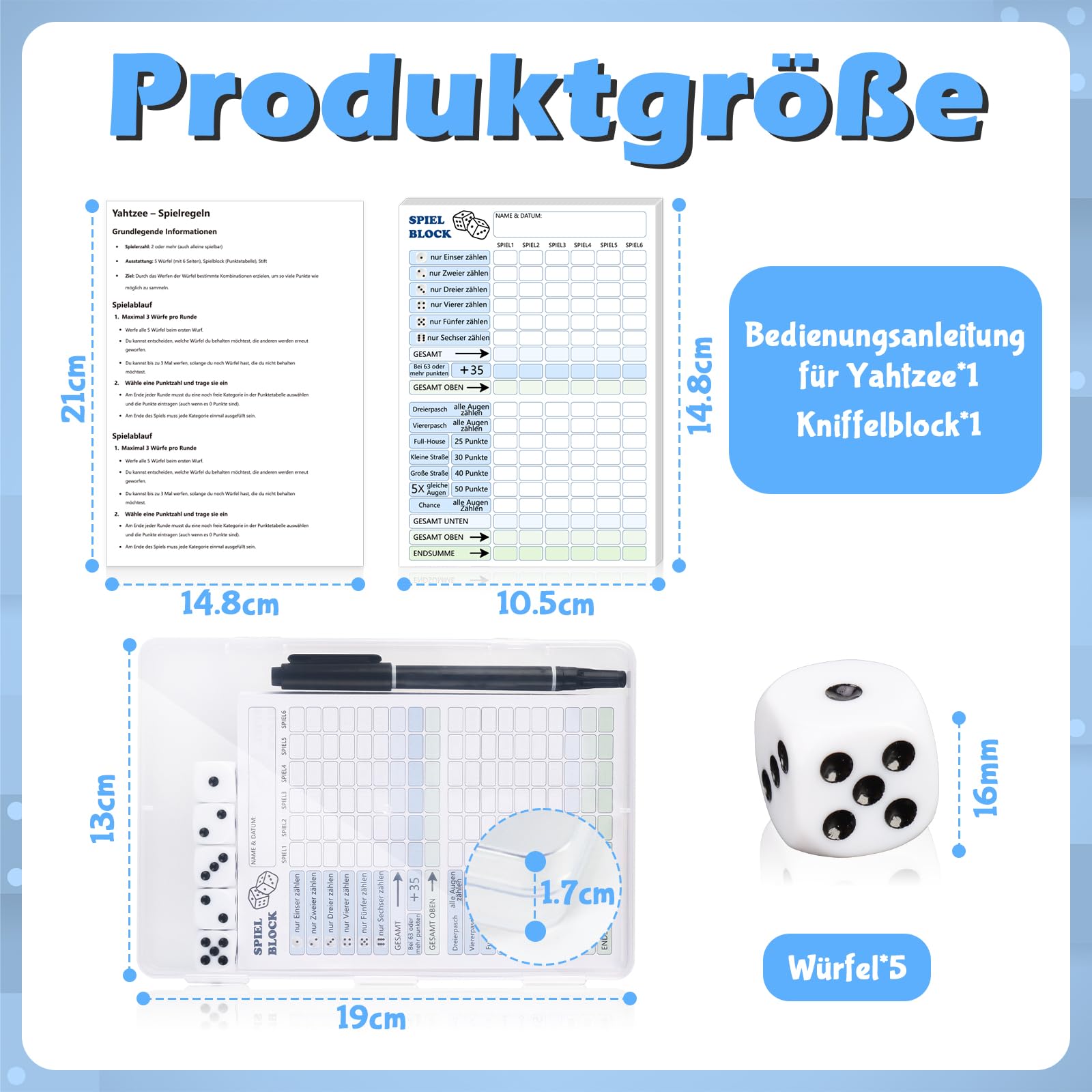 • ELEGANT DESIGN PERFECT FIT The 7.5 x 6 x 9 cm cube cup is easy to carry and use. The size of the score pad (Speedboat dice score pad: 14.8 x 10.5 cm, poker dice score pad: 16 x 8 cm) is standard size and suitable for most game scenarios. 16mm cube and instructions (14.8 x 21cm) are suitable. The dice plate with 24.5 cm diameter is non-slip and robust and thus ensures a stable stand during the game.
