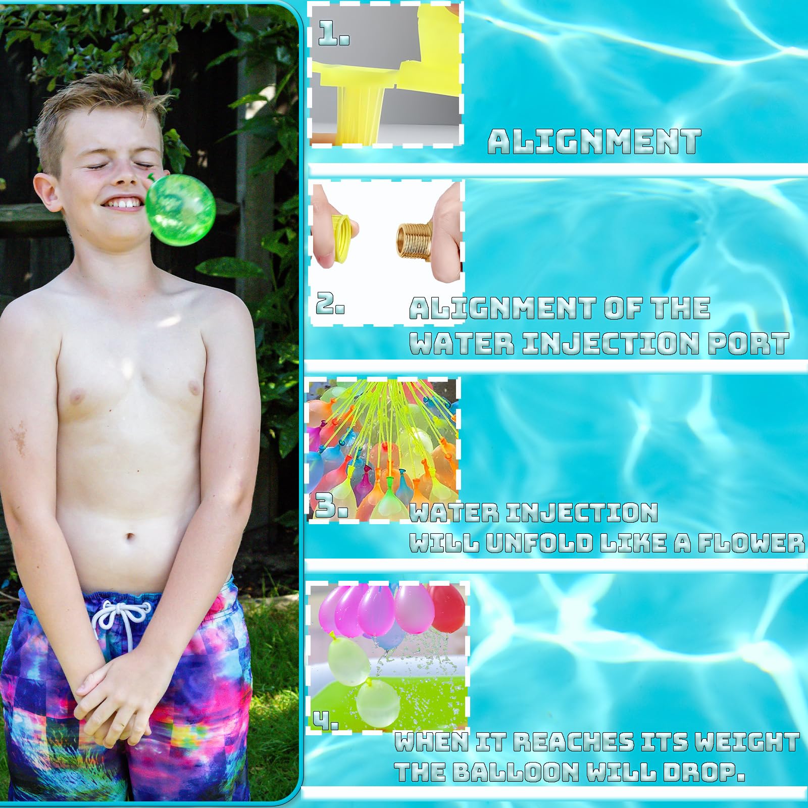 • Quick & Easy Water BalloonsFill these high-quality latex water balloons in under 60 secondsno hassle, no mess! Just attach them to a tap or hose, and they inflate instantly, so you can get right into the action