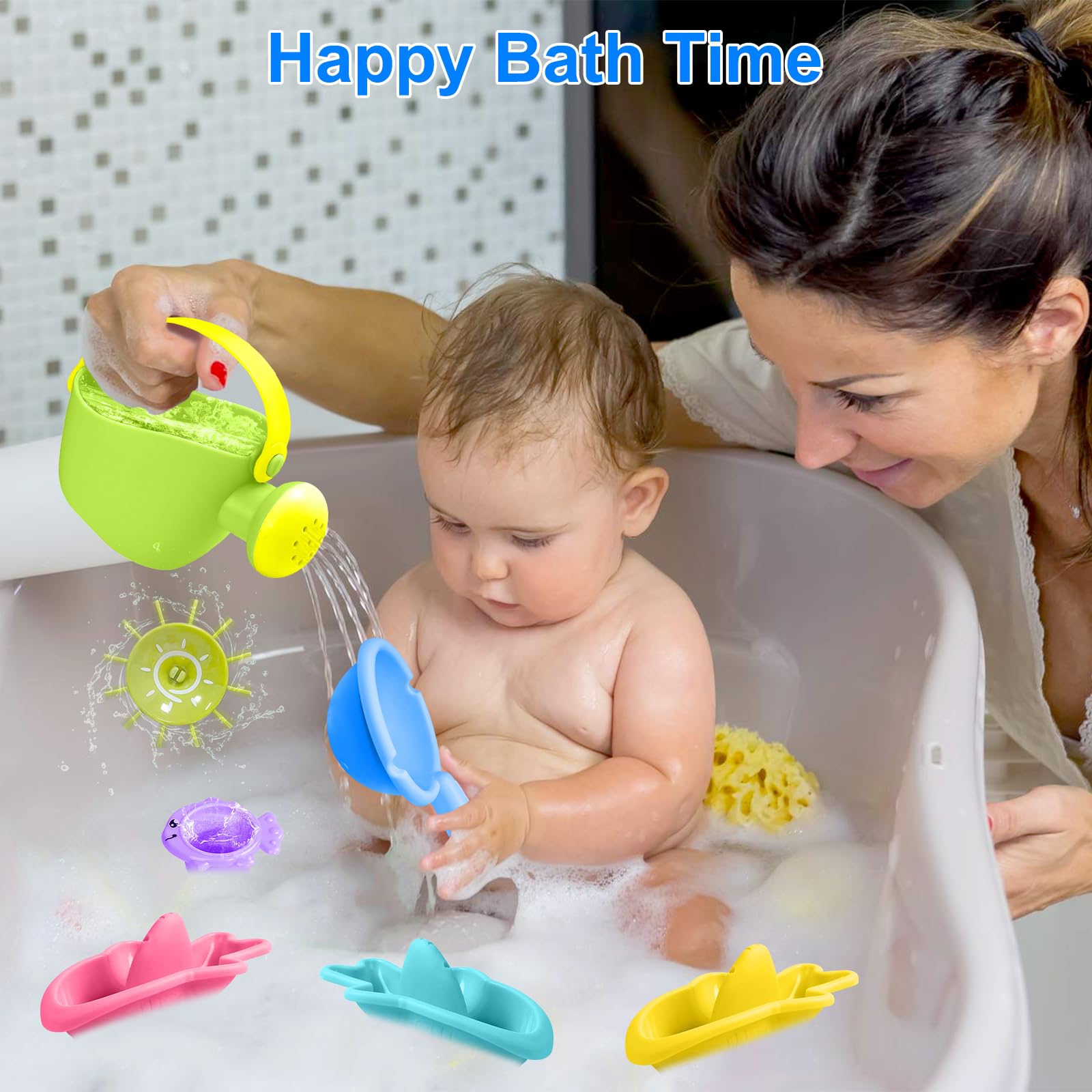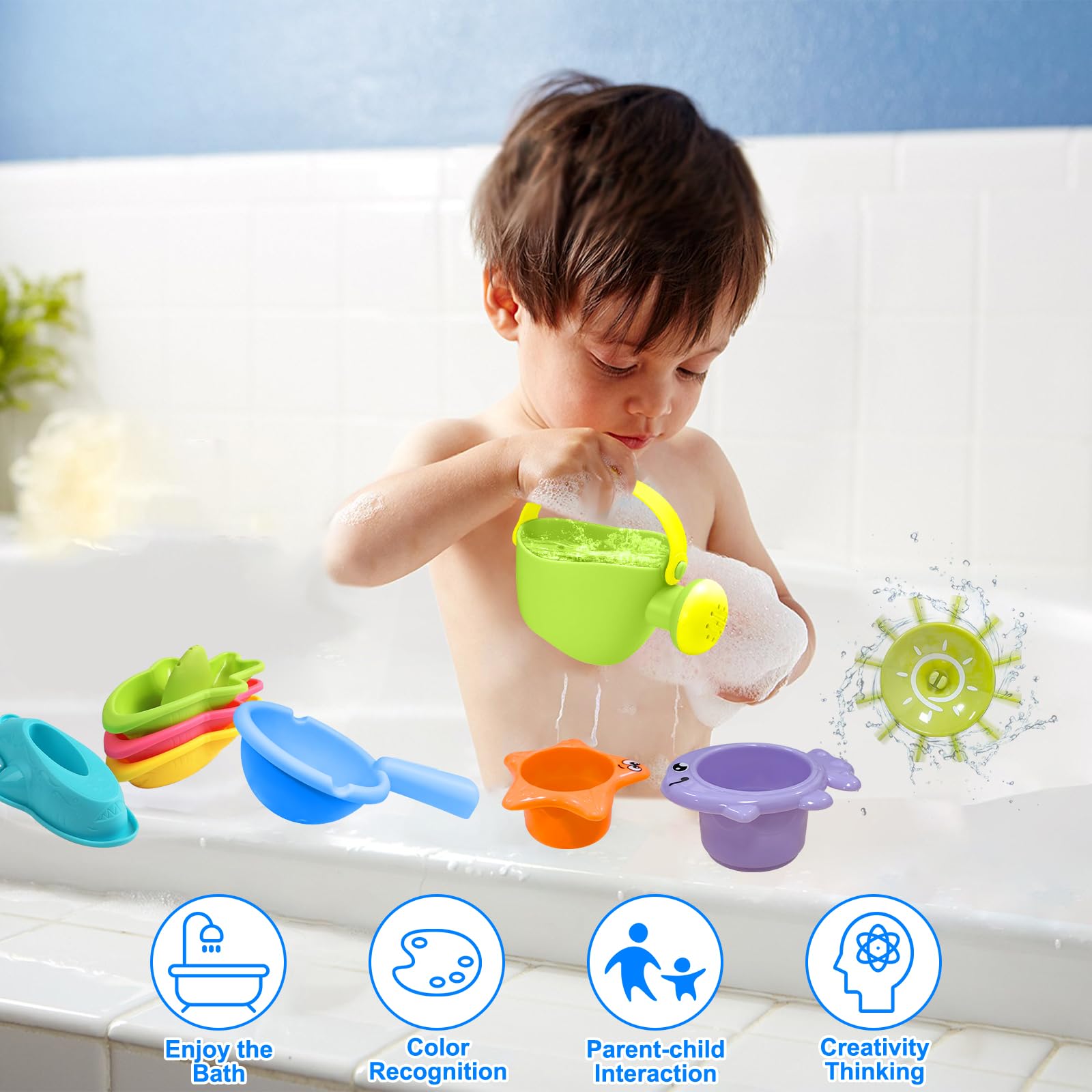 - 10Pcs Cute Bath Toys – Bath toys include 1 watering can, 1 colander, 1 suction cup spinning water wheel, 3 stacking cups with sea animals and 4 bath boats, making them ideal bath toys for boys and girls