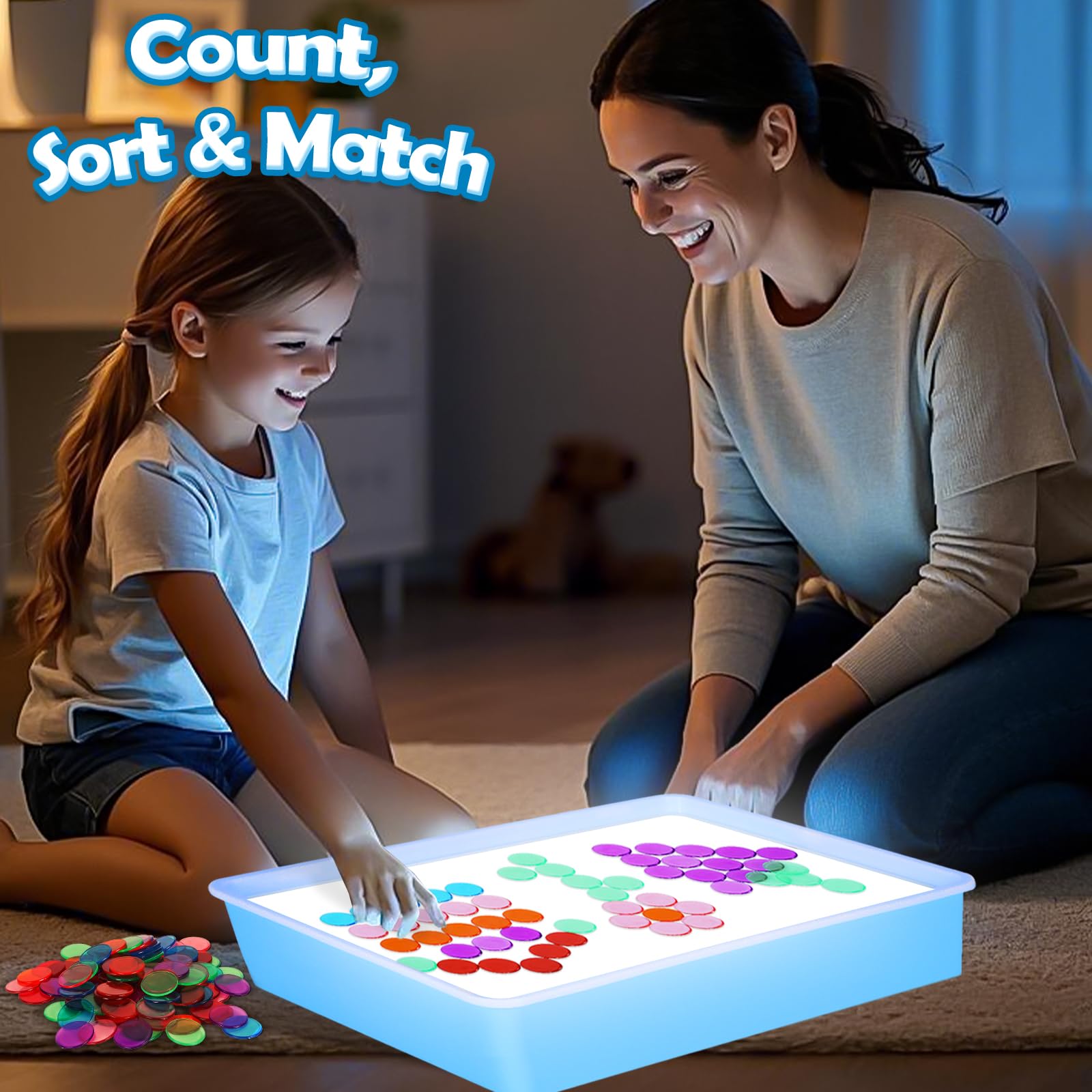 - Adjustable Brightness — With 10 different brightness settings and a blue-light-free design, our sensory activity table measures 38.5*26.7*8cm and allows kids to achieve the perfect light and color exploration.