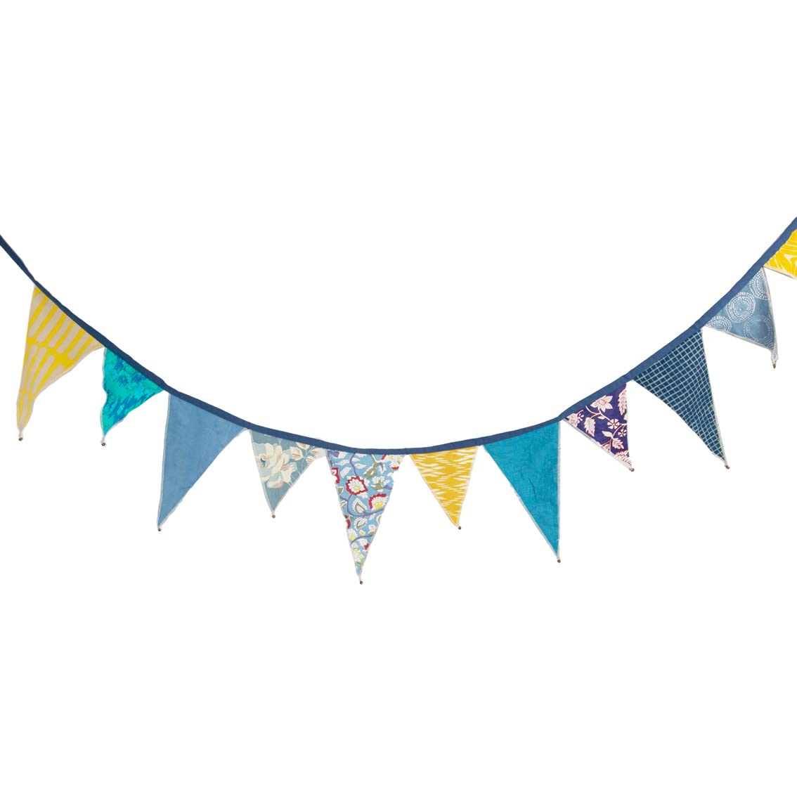 - Elevate your indoor or outdoor space with this beautiful blue and yellow fabric bunting by Talking Tables. Made from remnants of cotton, this handmade upcycled fabric bunting is 100% unique with bell detailing on each flag