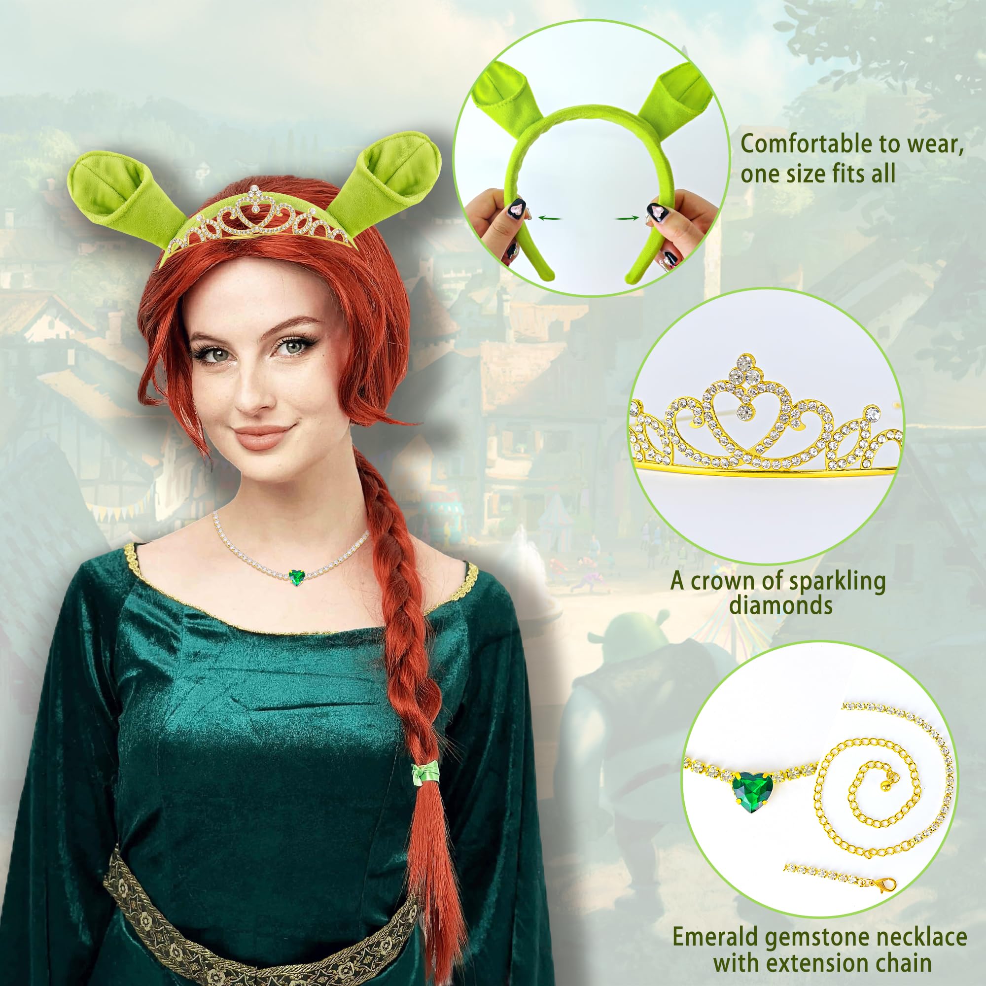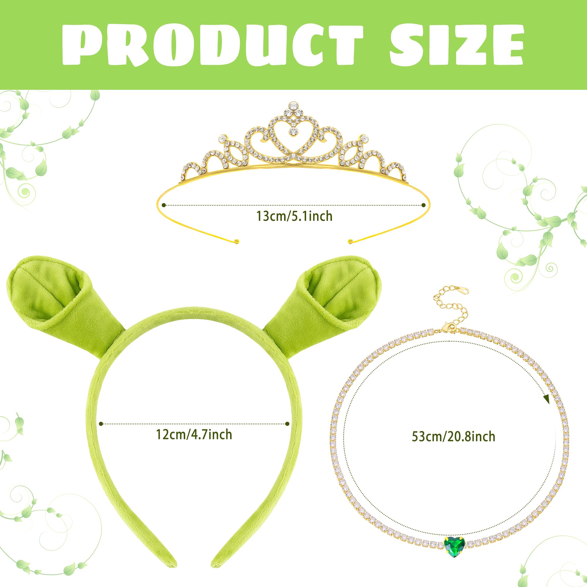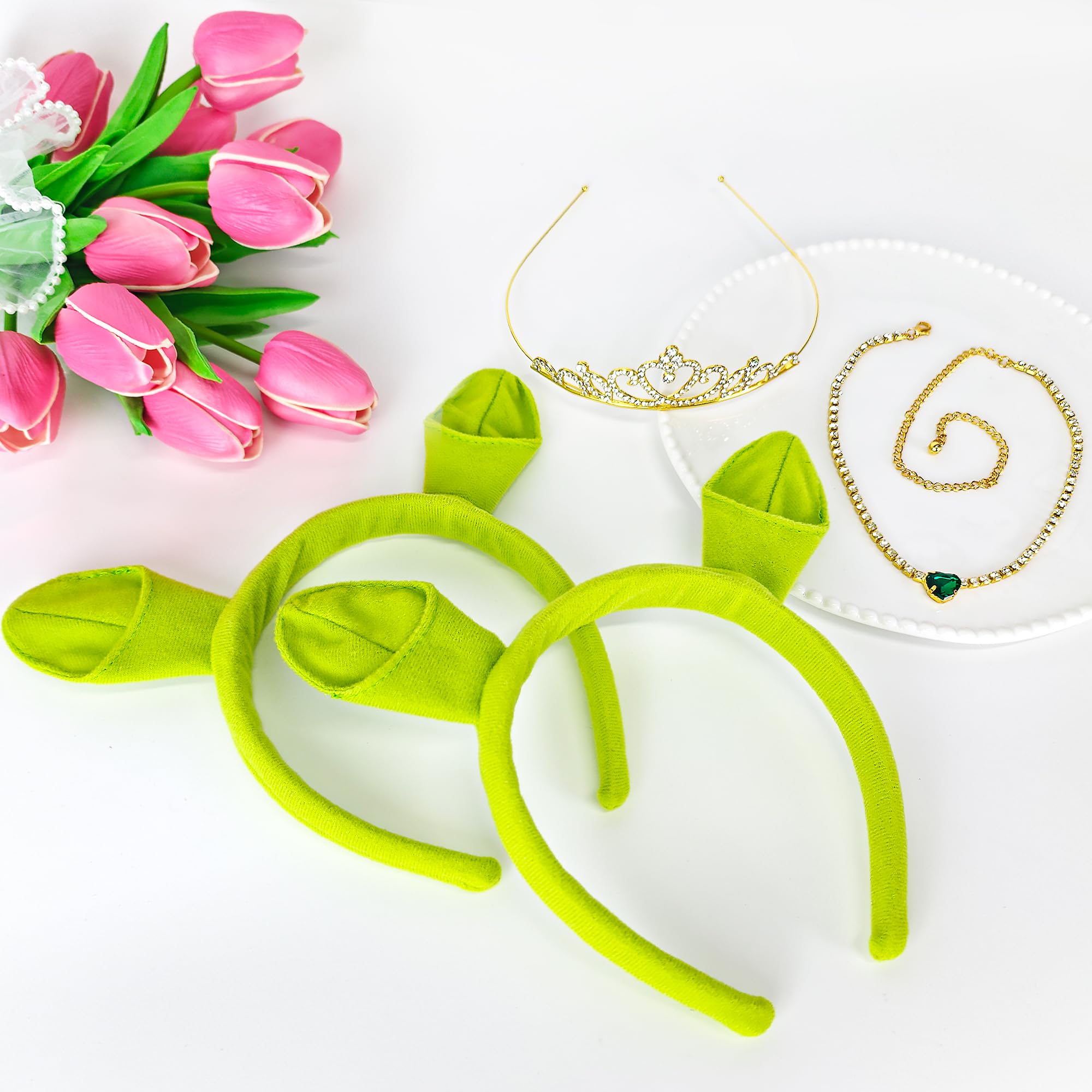 - OGRE EARS HEADBAND SET – This fun cartoon animal ogre set includes two delicate ogre ear headbands, a gorgeous gold crown, and a heart-shaped emerald necklace. With the unique green monster ears, you’ll instantly look like a character from the animated series.
