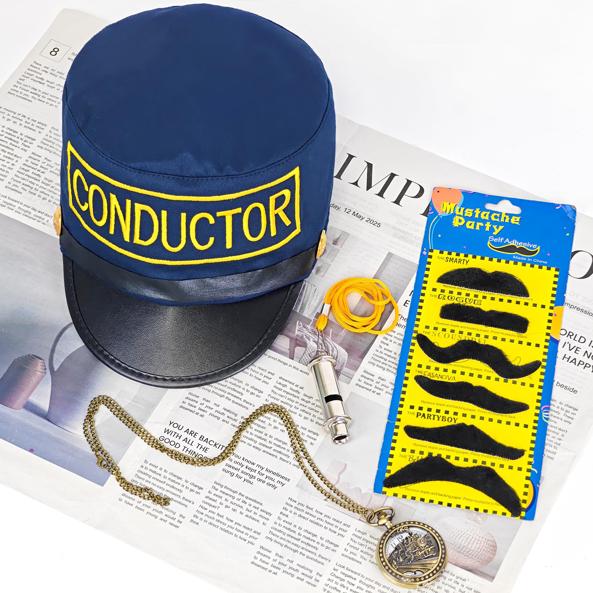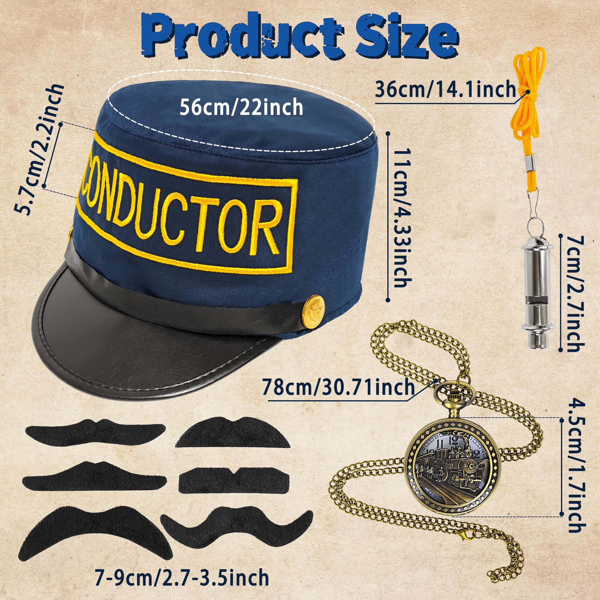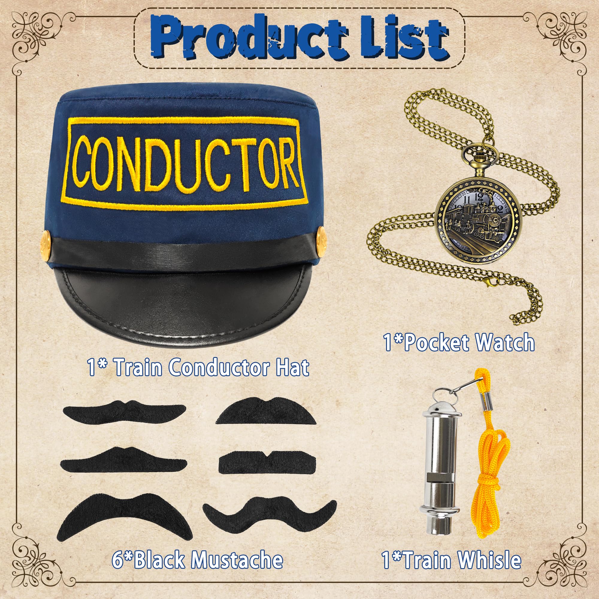 - PACKAGE LISTING – Train conductor costume accessories includes 1* navy blue train conductor hat, 1* metal train whistle, 6* black mustaches, and 1* vintage pocket watch. Each accessory is meticulously designed, and the complete train conductor set allows you to effortlessly portray the authentic image of a train conductor without the need for additional purchases.