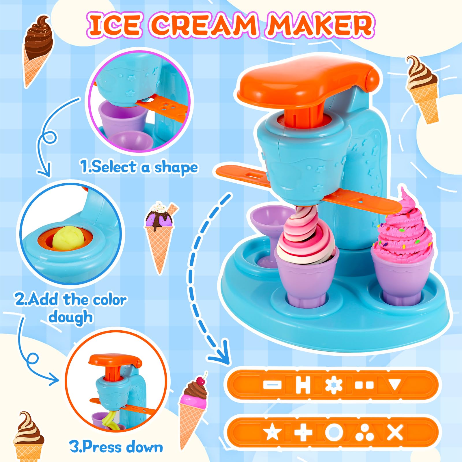 - High QualityThe ice cream maker is made from eco-friendly material, harmless to kids and not easy to break. Each Color Dough accessory is made of safe and high quality plastic, a material that is very sturdy and colorful, non-toxic. Color dough is made of edible wheat flour, non-greasy, non-sticky, can be used repeatedly, 100% safe. Kids will love it!