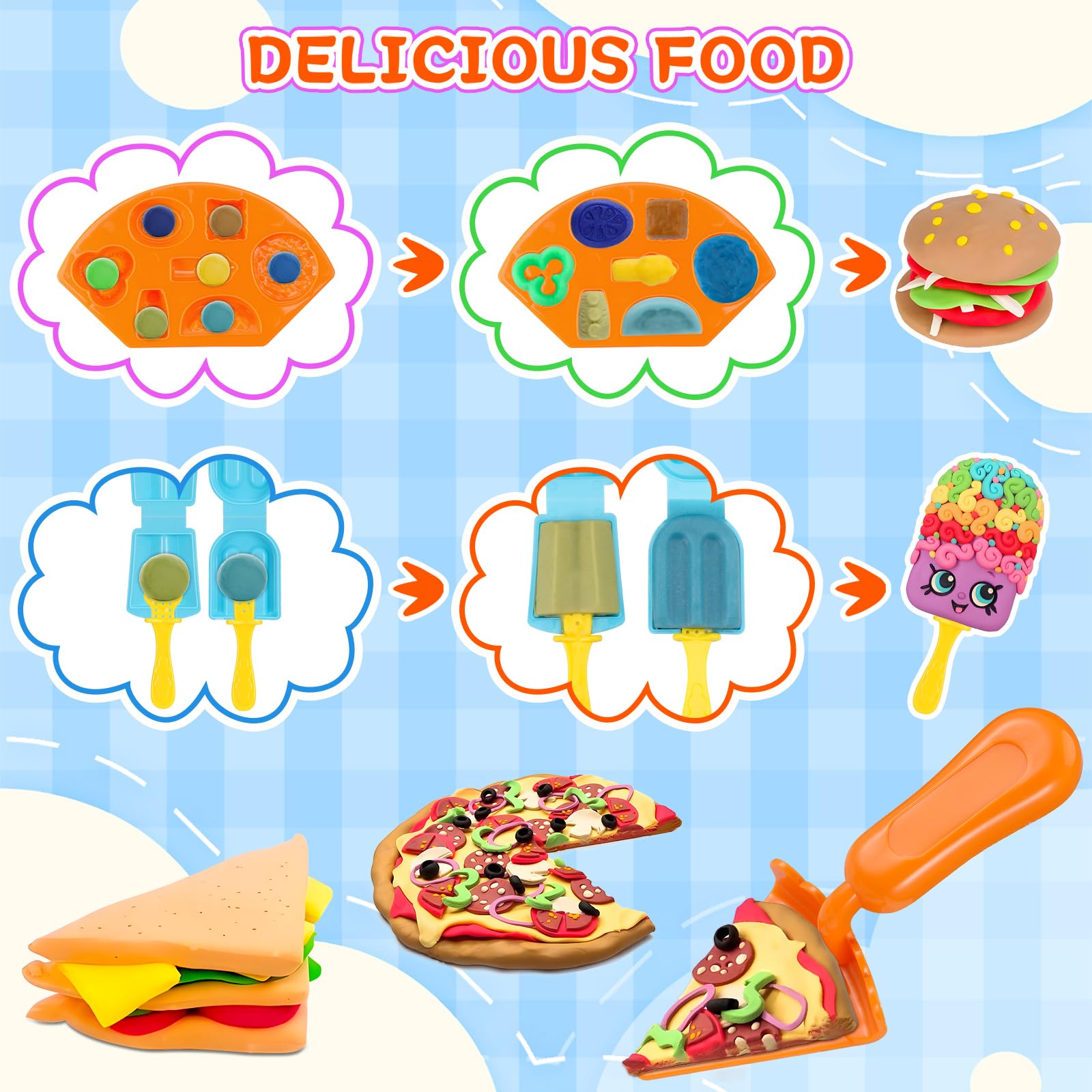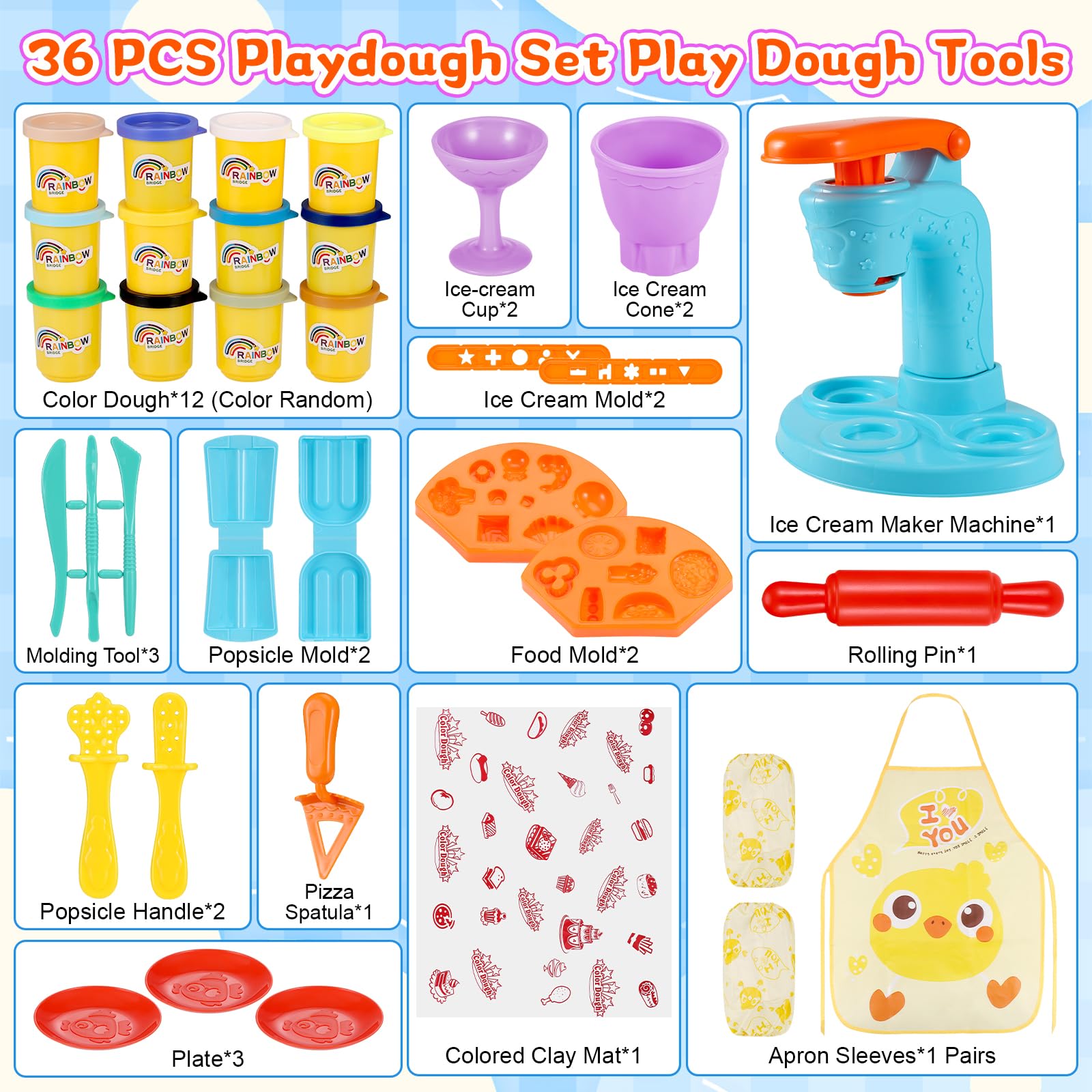 - Play Color Dough Set with Sleeves and ApronsThe play color dough set comes with a variety of tools, Color Dough*12, Ice Cream Maker Machine*1, Ice Cream Cone*2, Ice-cream Cup*2, Ice Cream Mold*2, Molding Tool*3, Popsicle Mold*2, Food Mold*2, Rolling Pin*1, Popsicle Handle*2, Pizza Spatula*1, Plate*3, Colored Clay Mat*1, Apron Sleeves*1 Pairs, 36 pcs in one set. A complete Dough set, no need to purchase additional accessories!(Accessories color random)