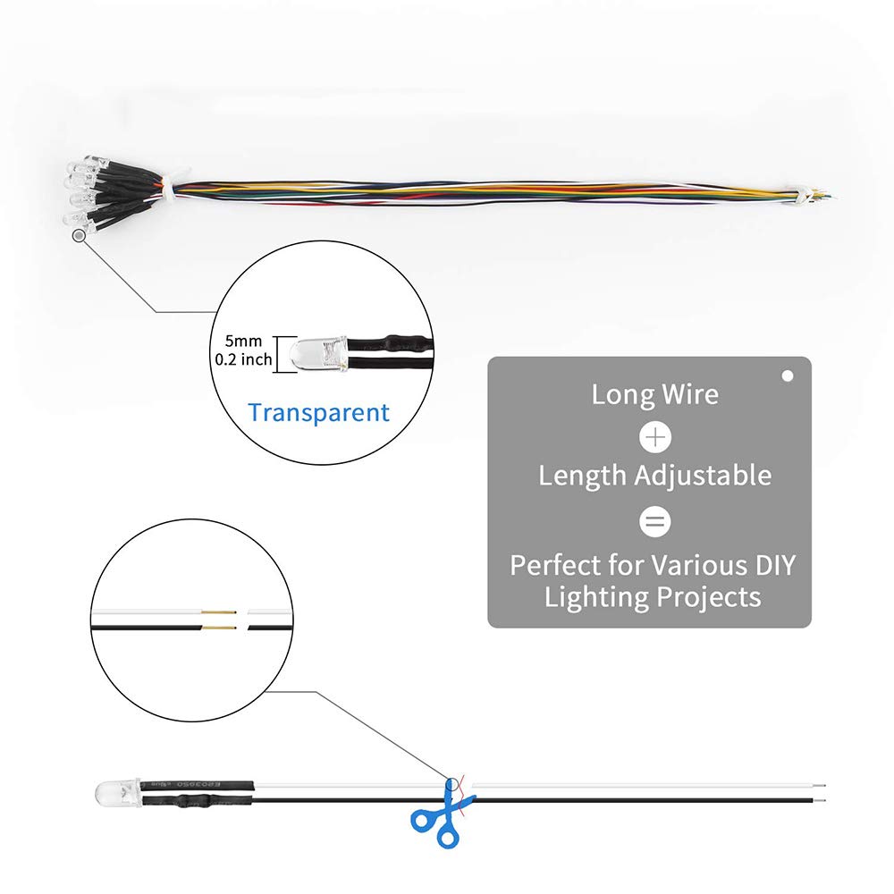 - Product Overview: 100pcs Prewired DC 12V 5mm LED -20pcs 5 Color (20pcs for Each Color – White / Red / Yellow / Green / Blue)