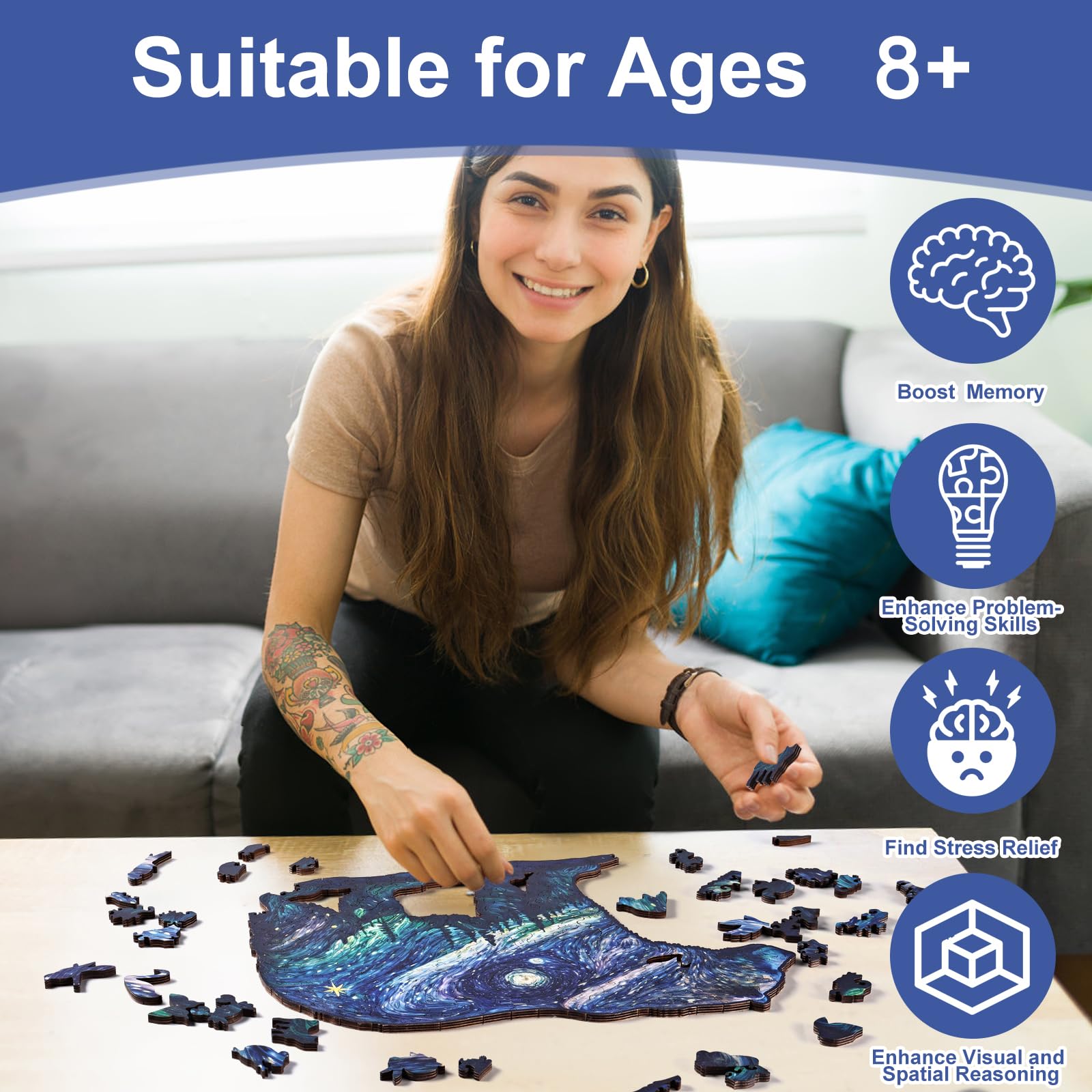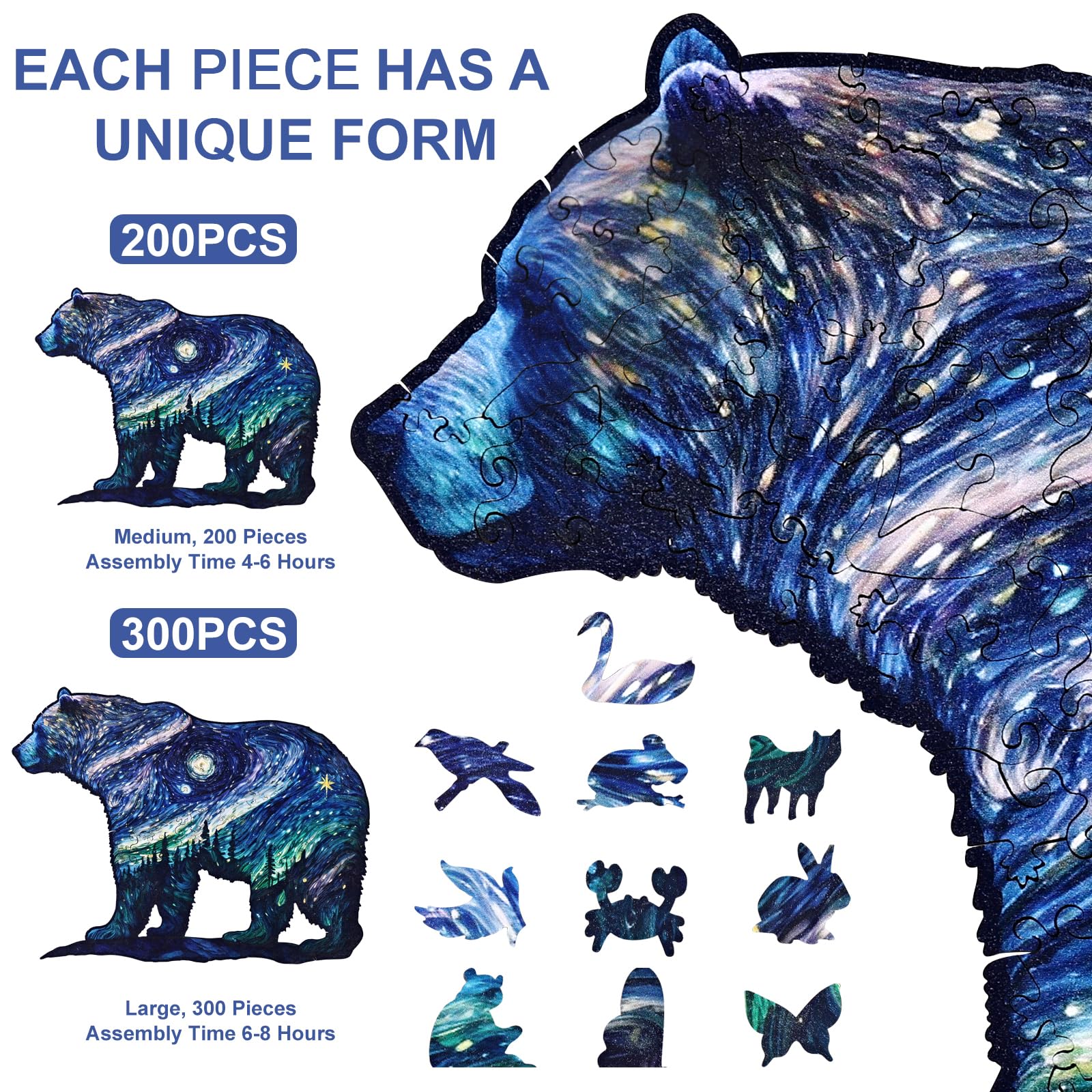 YJacuing Wooden Jigsaw Puzzles for Adults, 200 Piece Unique Animal Shaped Premium 5mm Wood Puzzles Family Game (Starry Bear, Medium)